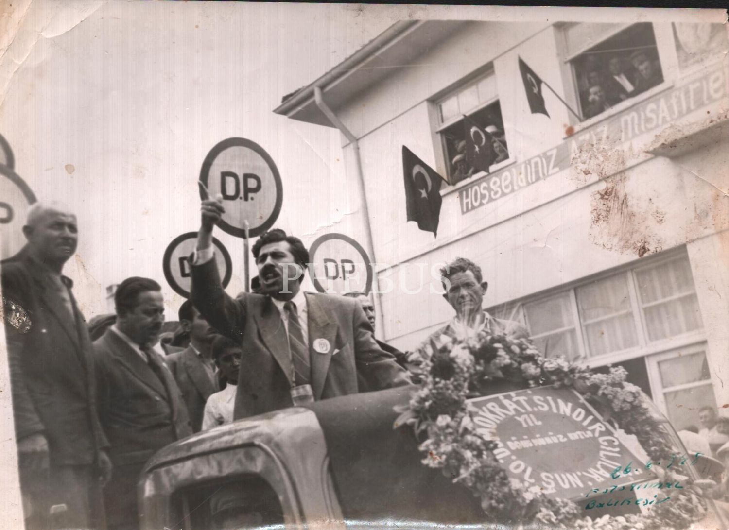 Demokrat Parti seçim aracı üstünde konuşma yapan bir siyasetçi, 1948, Foto Yılmaz Balıkesir, 17x24 cm
