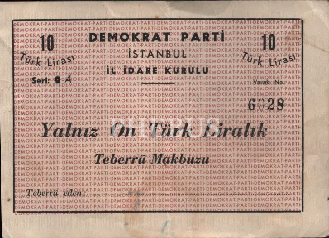 Demokrat Parti 10 Türk liralık teberru makbuzu, 10x14 cm