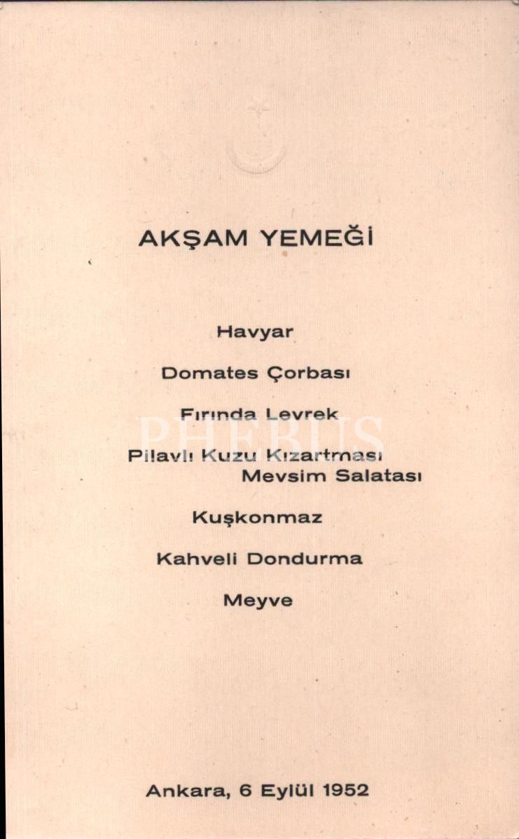 6 eylül 1952´de Ankara´da bir protokol yemeği için hazırlanmış menü, 10x15 cm