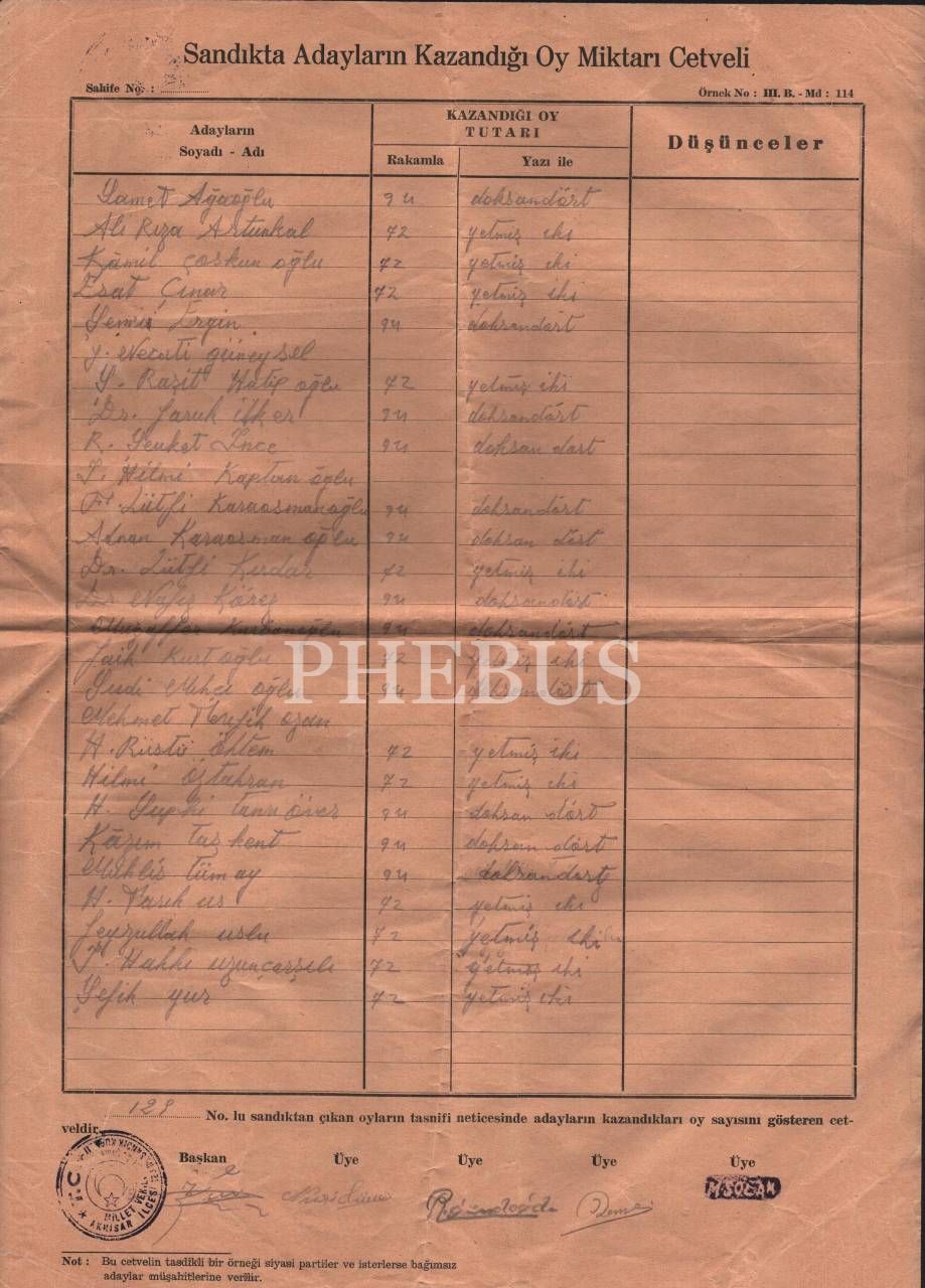 T. C. mühürlü sandıkta adayların kazandığı oy miktarı cetveli, 30x42 cm