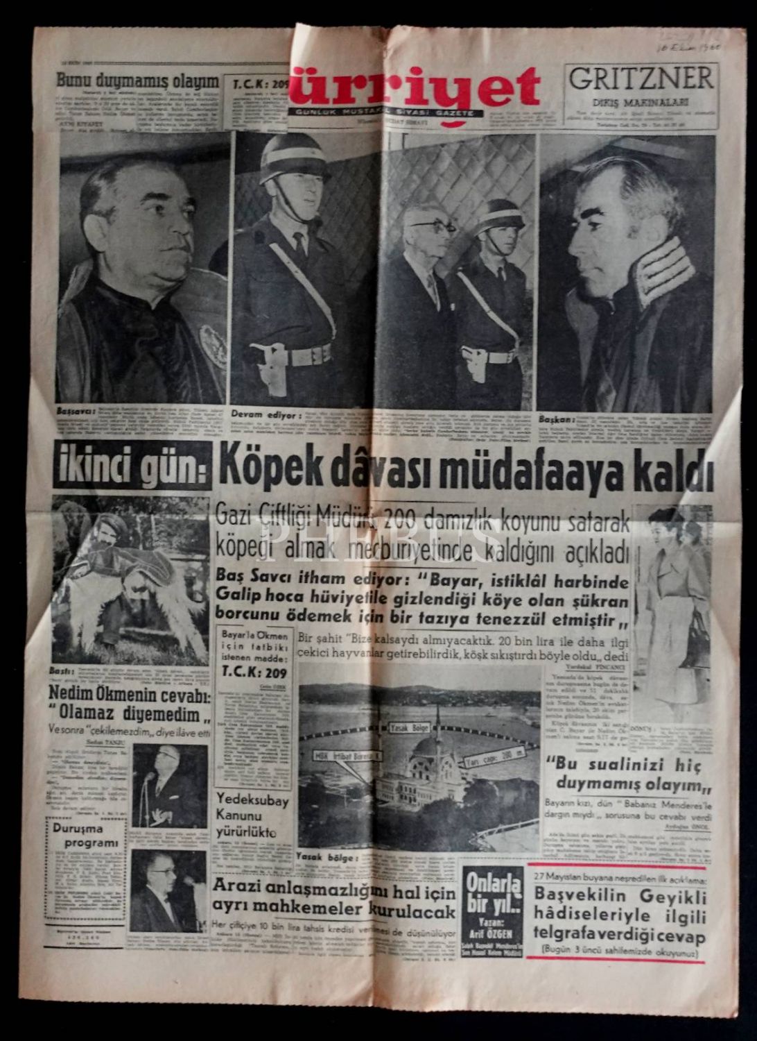 Celal Bayar´ın Yassıada savunmasını " Köpek Davası Müdafaaya Kaldı" başlığıyla manşete taşıyan 16 Ekim 1960 tarihli Hürriyet Gazetesi, 4 sayfa, 43x60 cm