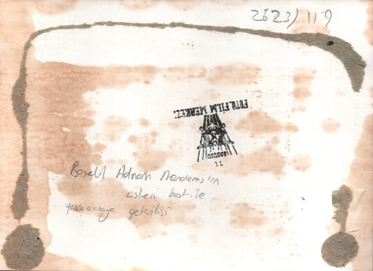 Başvekil Adnan Menderes´in askerî araç ile Yassıada´ya getirilişi, T. C. Ordusu Foto Film Merkezi kaşeli, 13x18 cm