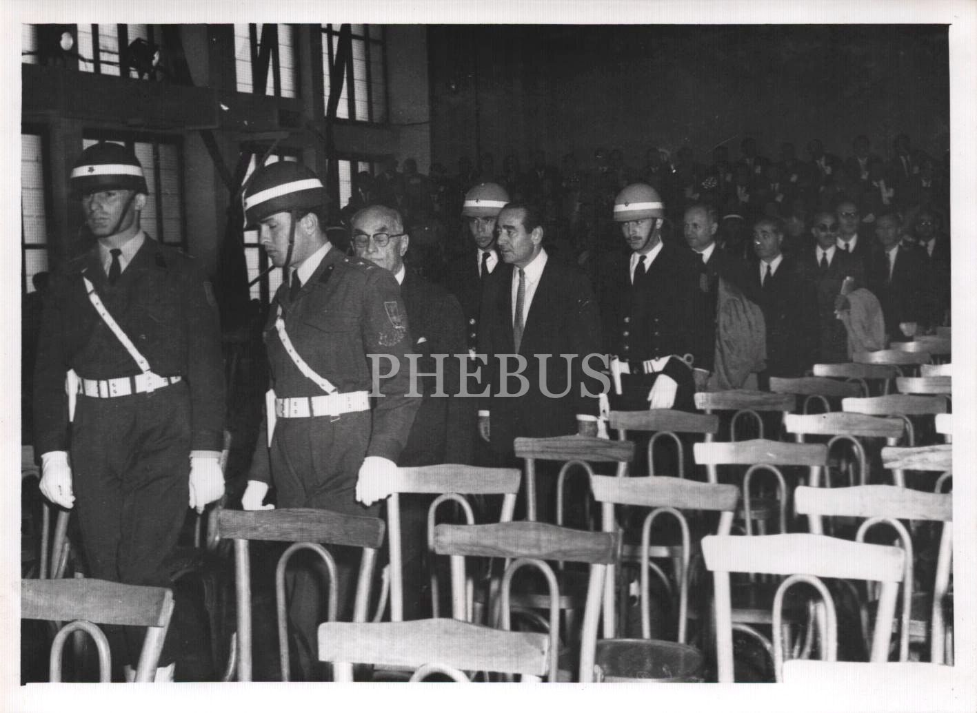 Celal Bayar, Adnan Menderes, Refik Koraltan, Fatin Rüştü Zorlu, Hasan Platkan ve diğer Demokrat Partili vekillerin idam kararı öncesi mahkeme salonuna girişi, T. C. Ordu Film Merkezi kaşeli, 13x18 cm
