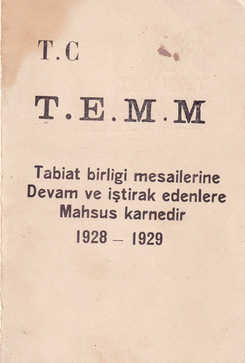 Tabiat Birliği Mesailerine İştirak Edenlere Mahsus kimlik, 1928 tarihli, 8x13 cm