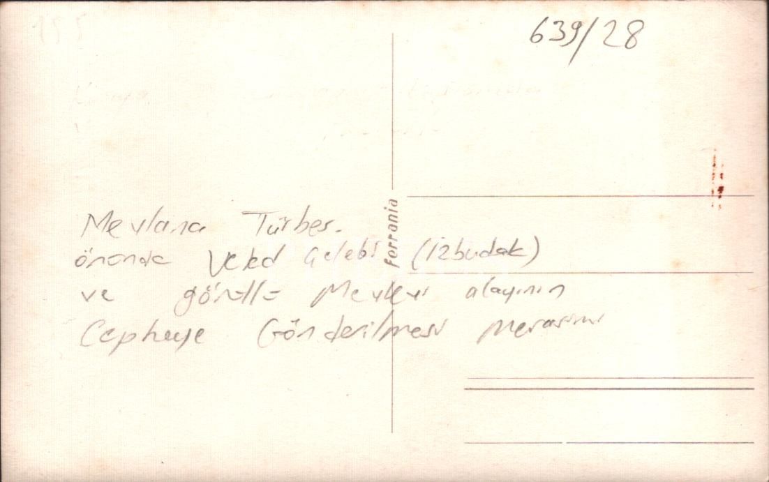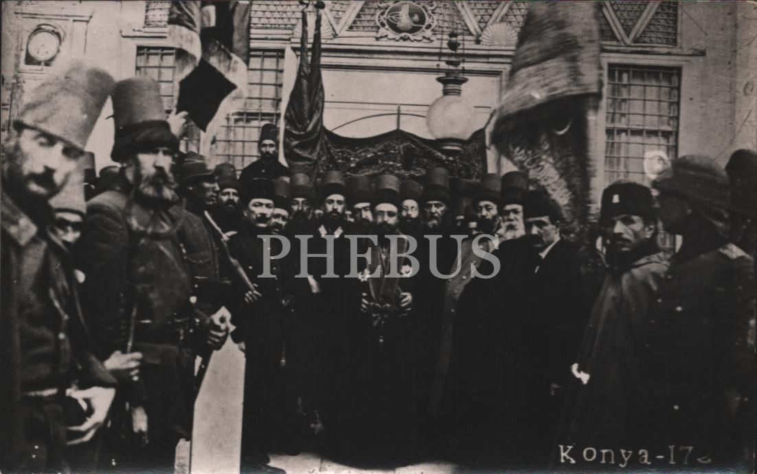 Konya Mevlana Türbesi önünde, Veled Çelebi İzbudak'ın da yer aldığı gönüllü Mevlevi alayının cepheye gönderilme merasimi