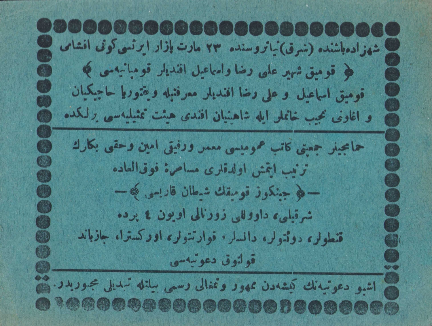 Şehzadebaşında (şark) tiyatrosunda 23 Mart pazartesi günü akşamı "Komik Şehir Ali Rıza ve İsmail Efendiler Kumpanyası" ... şarkılı davllu, zurnalı oyum 4 perde kantolar, danslar, orkestra, caz bandı davetiyesi