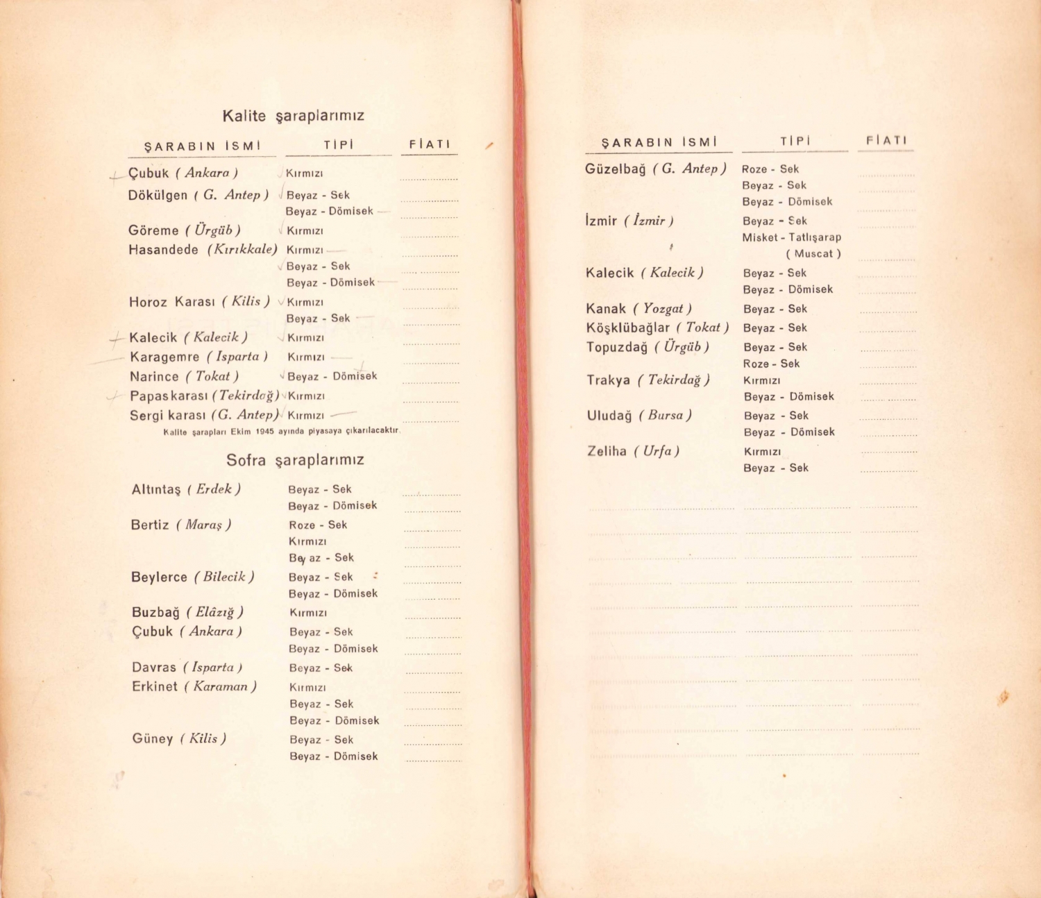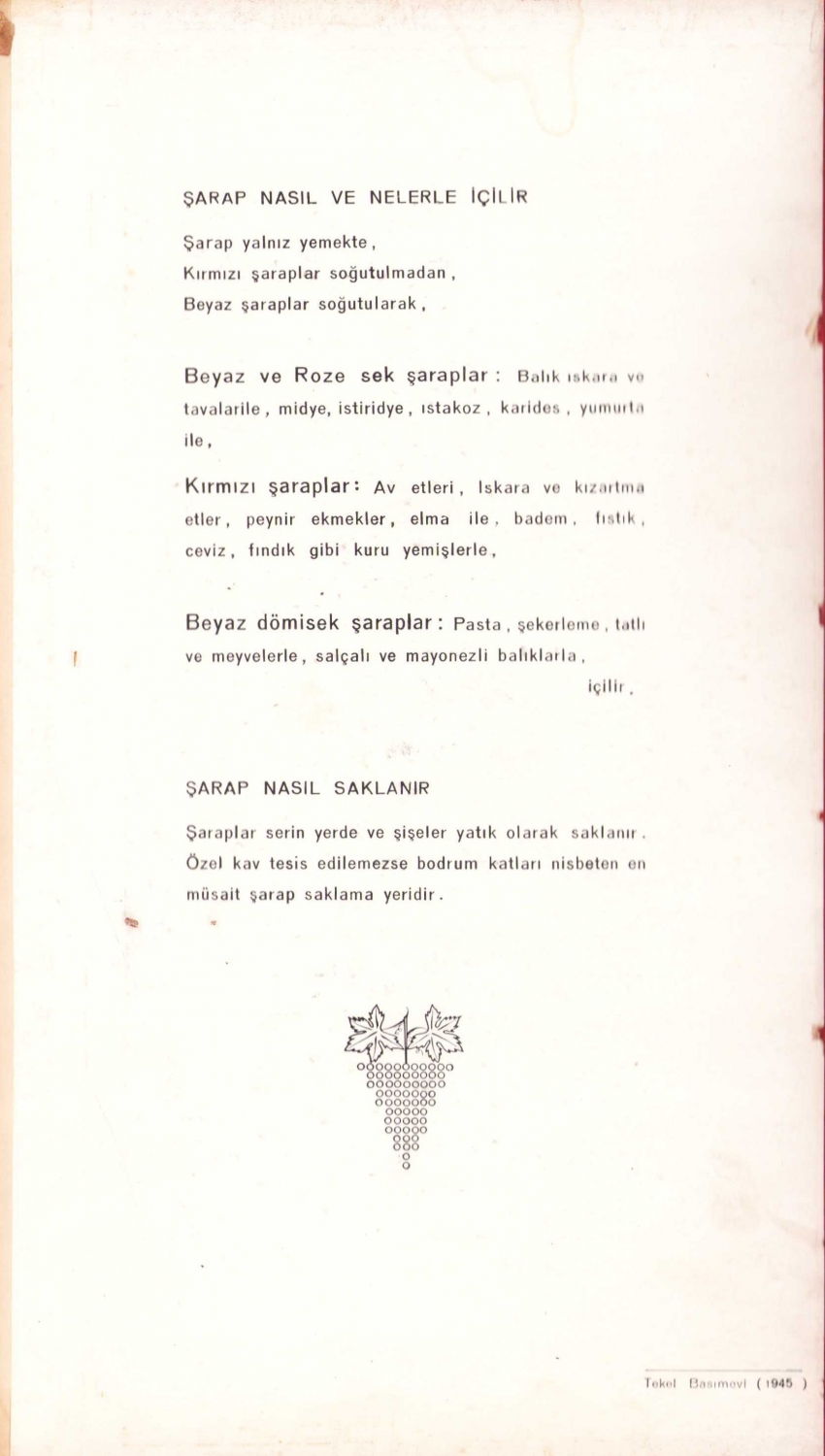 Şarap Listesi, Tekel Basımevi, 1945, cildi haliyle, 14x26 cm