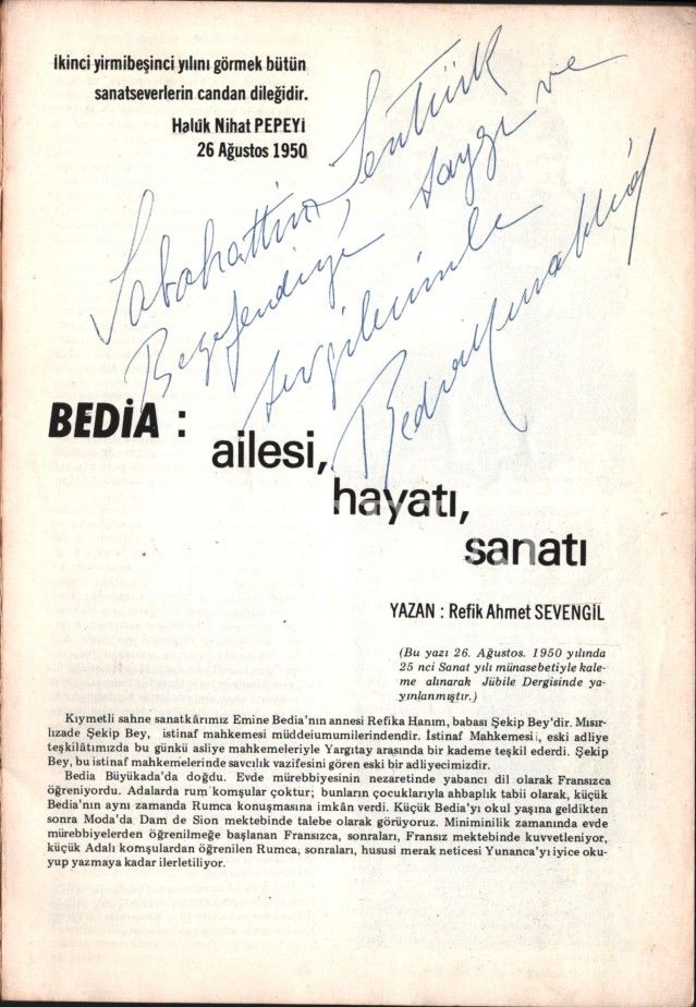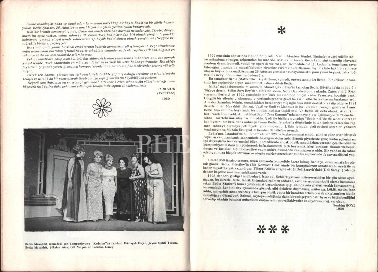 Bedia Muvahhit´ten ithaflı ve imzalı SAHNEDE 50 YIL - BEDİA MUVAHHİT, Güngör Gezer, Yörük Matbaası, 1973, 47 sayfa, 17x25 cm