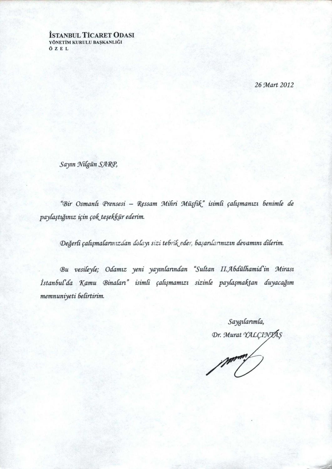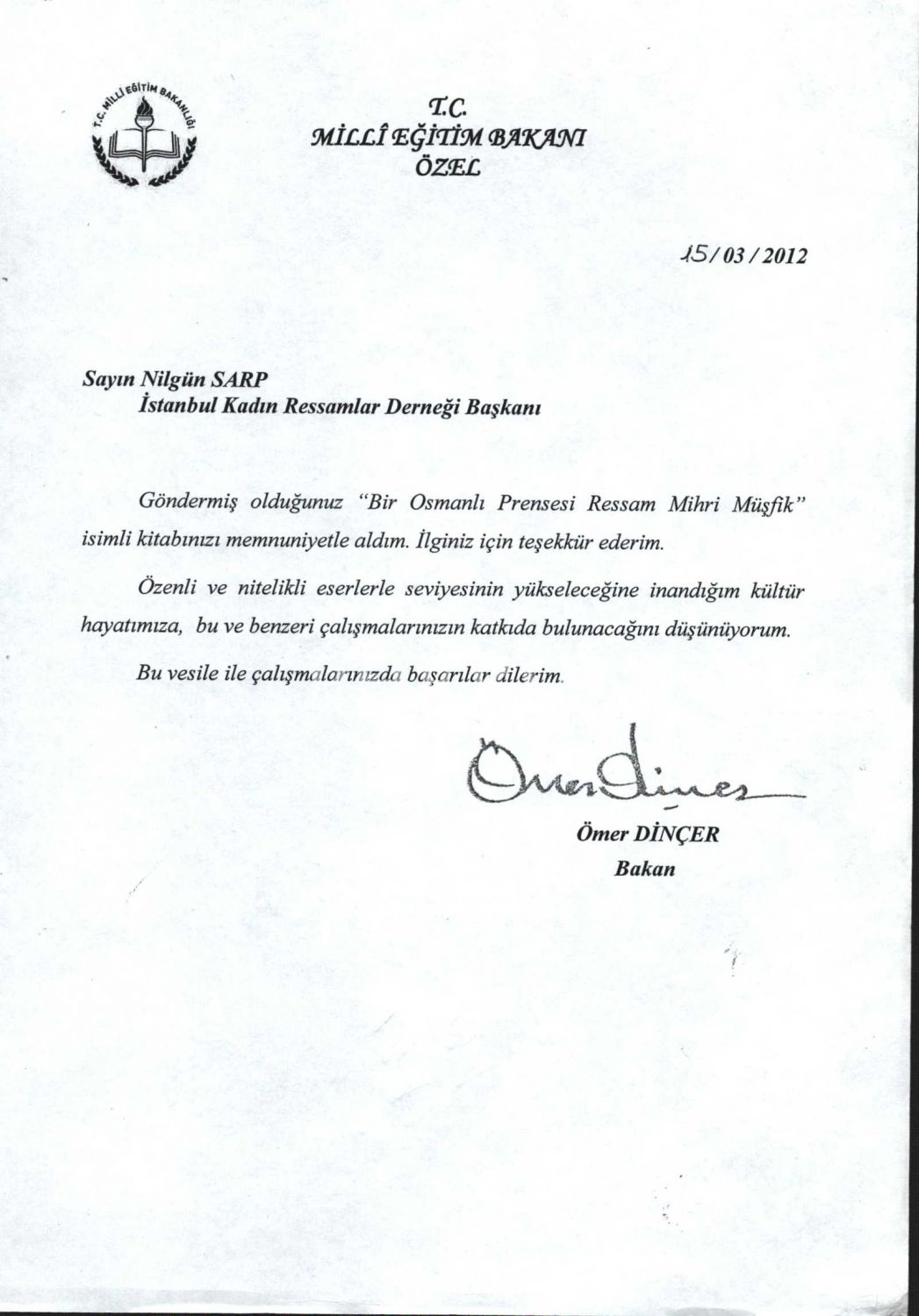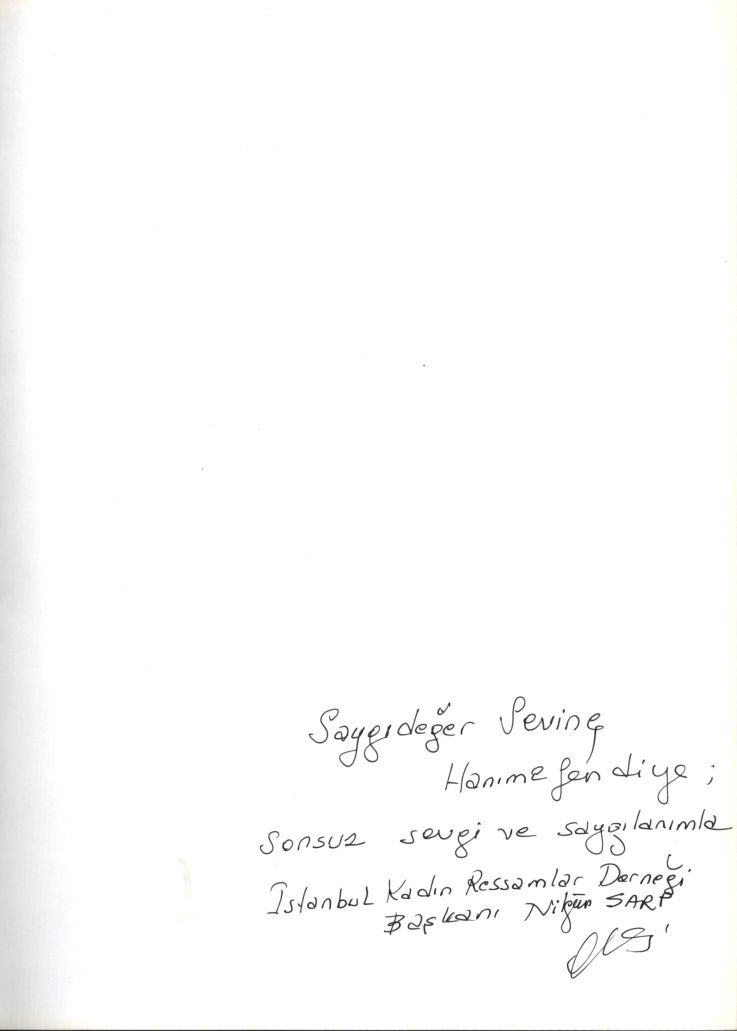 İthaf, "Saygıdeğer Sevinç Hanımefendiye; sonsuz sevgi ve saygılarımla. İstanbul Kadın Ressamlar Derneği Başkanı Nilgün Sarp" şeklindedir. Kitap içerisinde Ertuğrul Günay, Cemil Çiçek, Kadir Topbaş, Yalçın Karayağız, Murat Yalçıntaş ve Ömer Dinçer´in Nilgün Sarp´a gönderdikleri ıslak imzalı teşekkür mektupları mevcuttur.