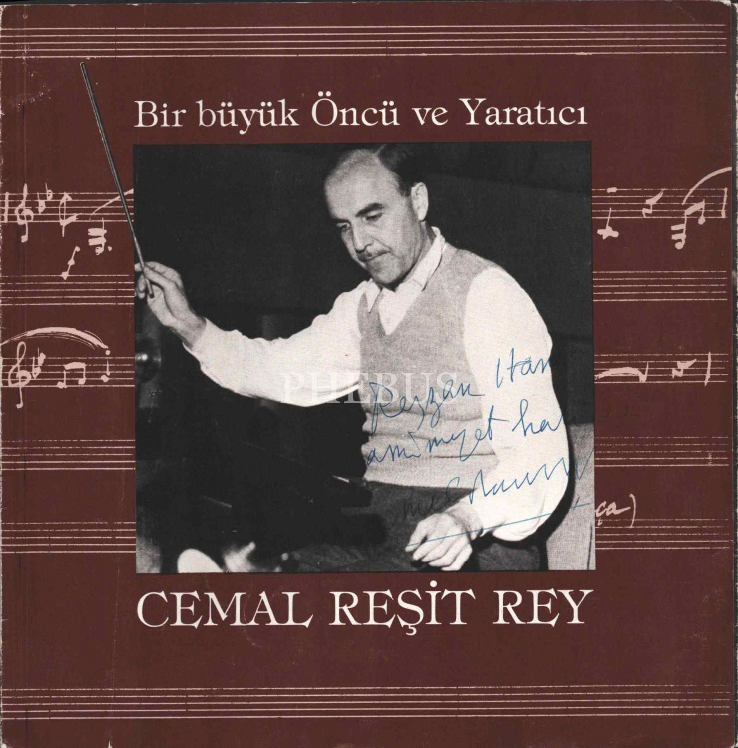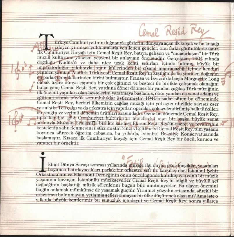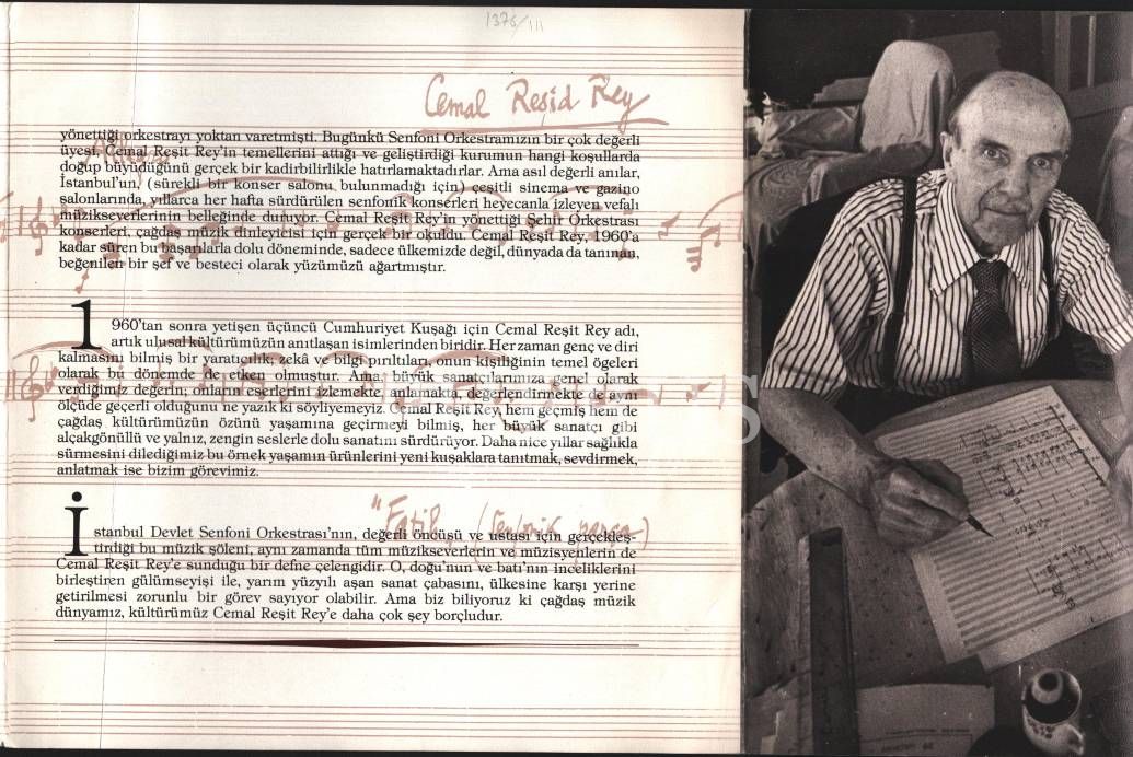 "Türk Beşlerinden" meşhur bestekar Cemal Reşit Rey´den ithaflı ve imzalı 80. yaş jübilesi dolayısıyla hazırlanan broşür: CEMAL REŞİT REY, 6 sayfa, 23x23 cm