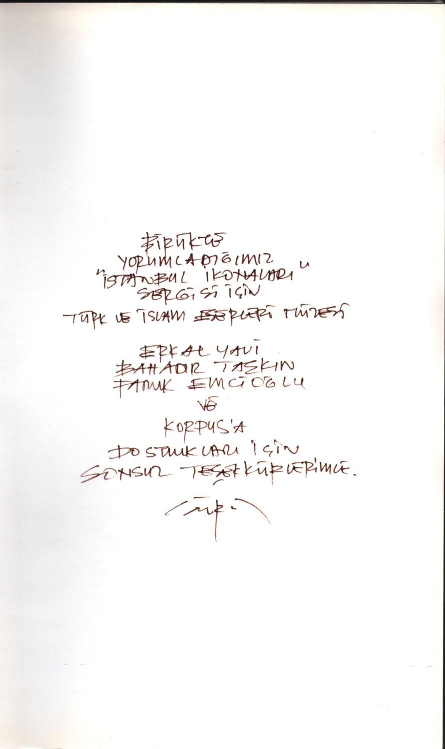 İthaf, "[?] yorumladığımız "İstanbul İkonaları" sergisi için Türk ve İslam Eserleri Müzesi - Erkal Yavi - Bahadır Taşkın - Faruk Emcioğlu ve Korpus´a dostlukları için sonsuz teşekkürlerimle." şeklindedir.