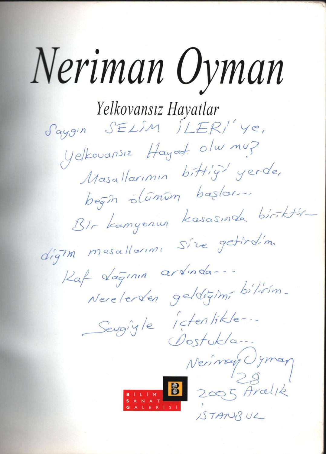 YELKOVANSIZ HAYATLAR, Neriman Oyman´dan Selim İleri´ye ithaflı ve imzalı, Bilim Sanat Galerisi, 63 sayfa, 23x30 cm