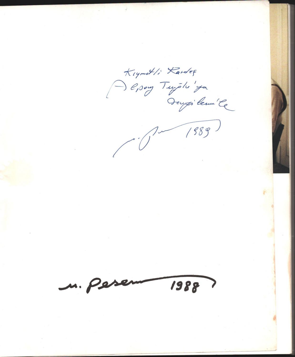 İthaf, "Kıymetli Kardeş Alpay Tuğlu´ya sevgilerimle - M. Pesen 1989" şeklindedir.