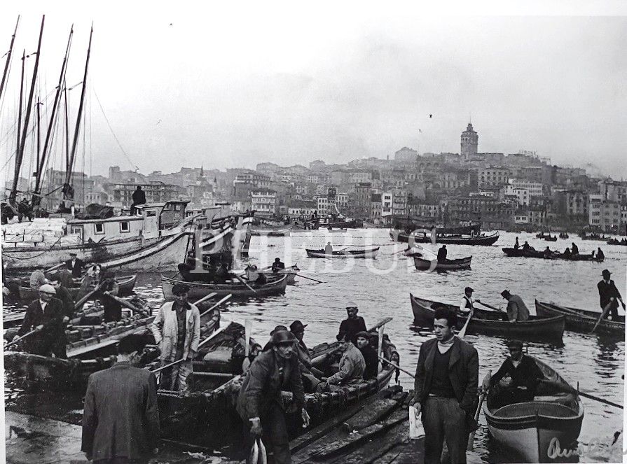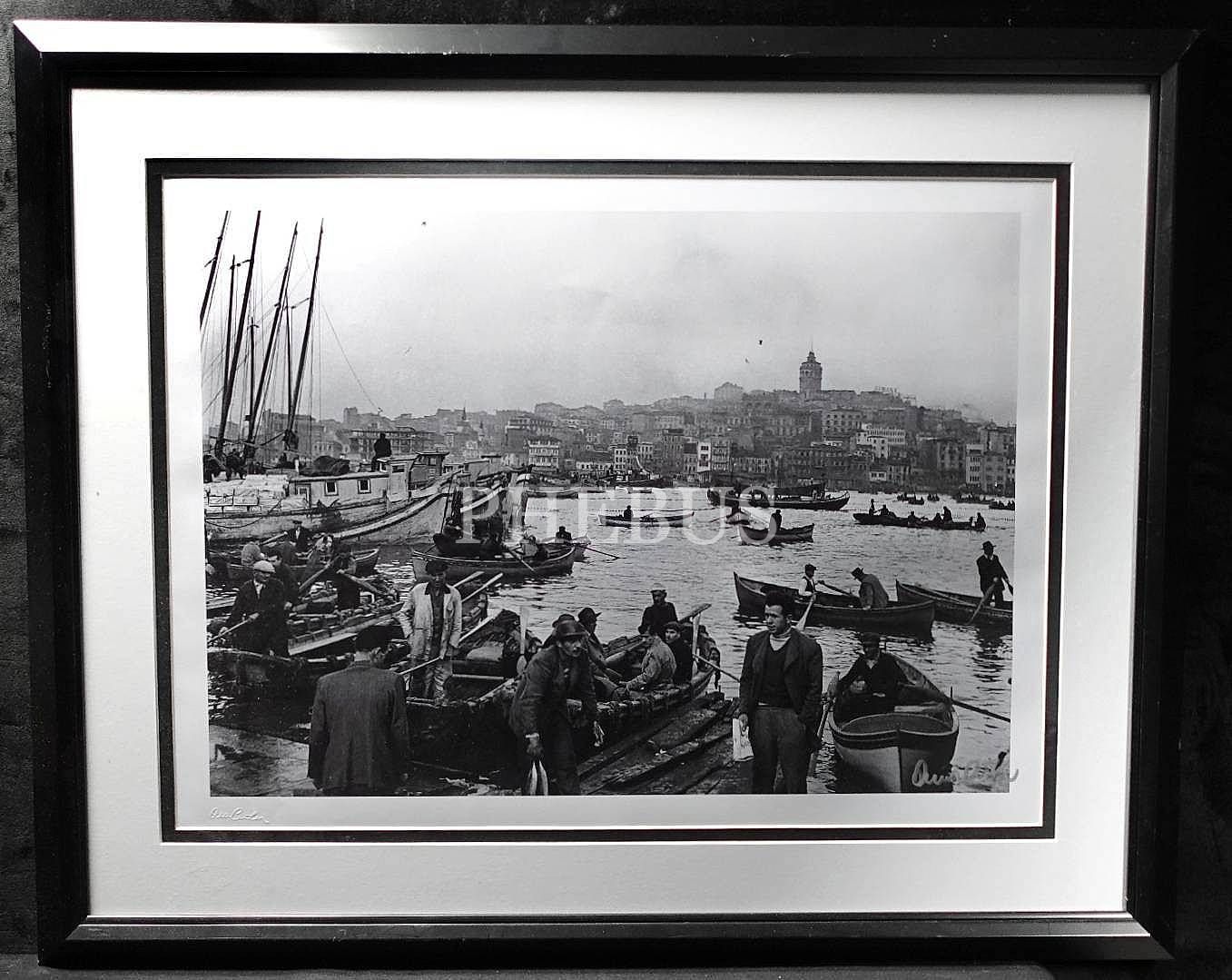 ''Eminönü'nden Galata'ya olta balıkçıları, 1956" Kabartma ve ıslak imzalı, arkası "Photographed by Ara Güler" kaşeli, fotoğraf, 49x36 cm