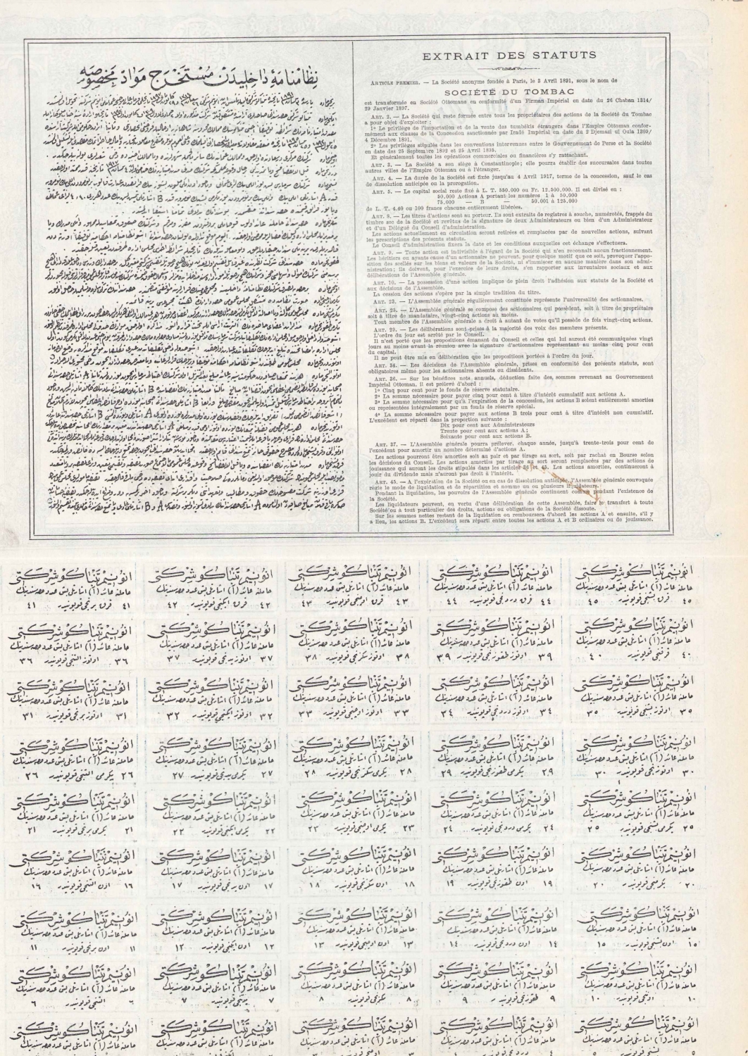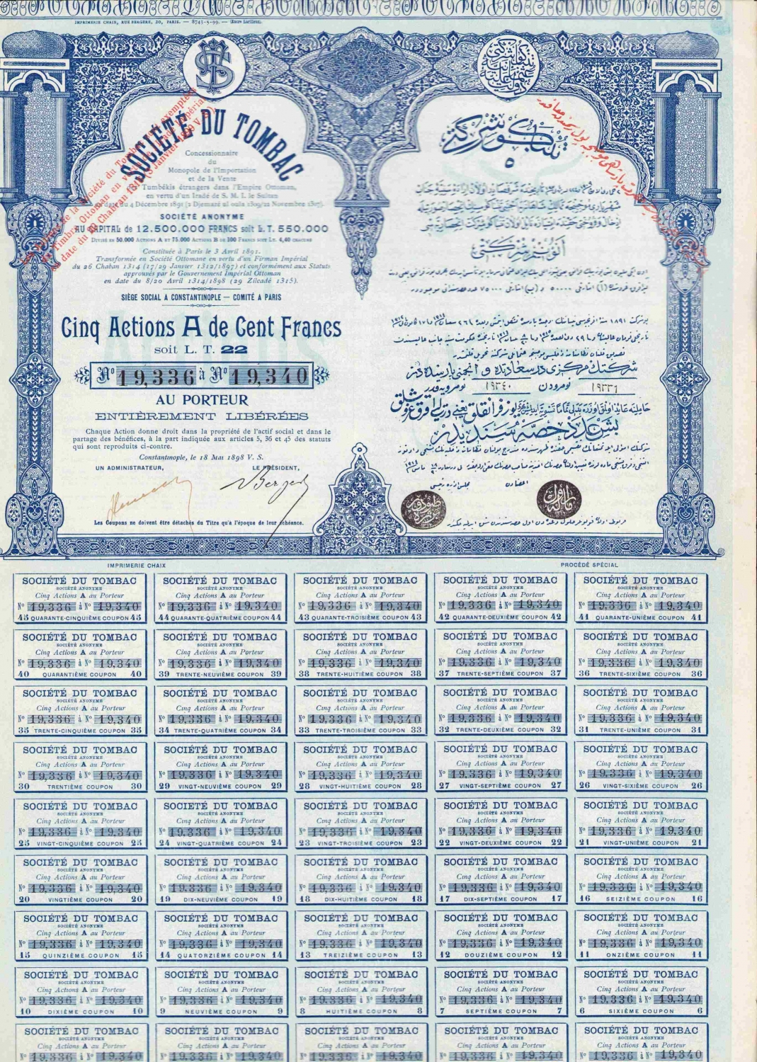 Tombak Osmanlı Tütün ve Tömbeki Anonim Şirketi 1898 5 hisse Osmanlıca - Fransızca ve mühürlü, 32x44 cm