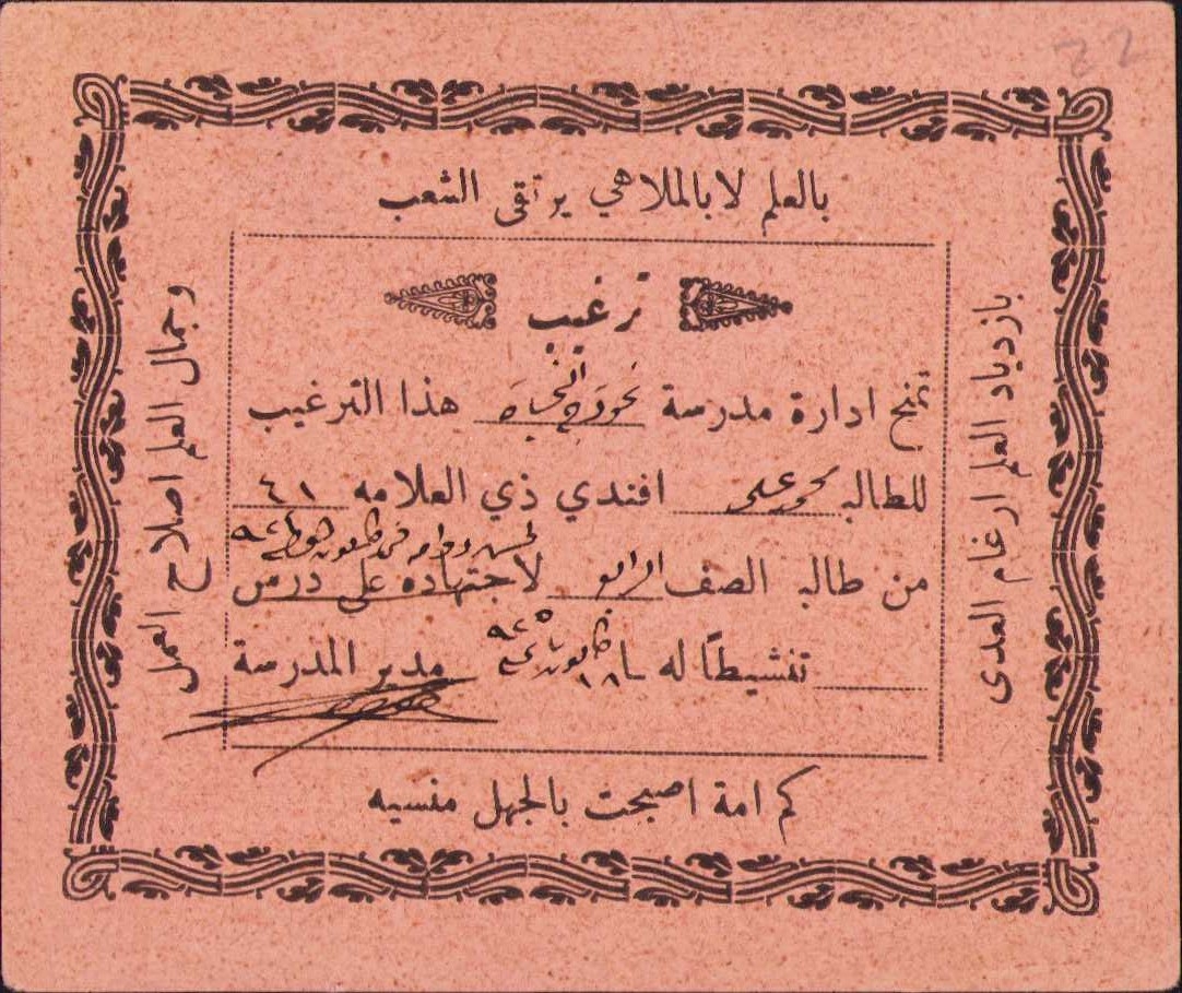 Arapça tergib (aferin) belgesi, 1924 tarihli, 9x8 cm
