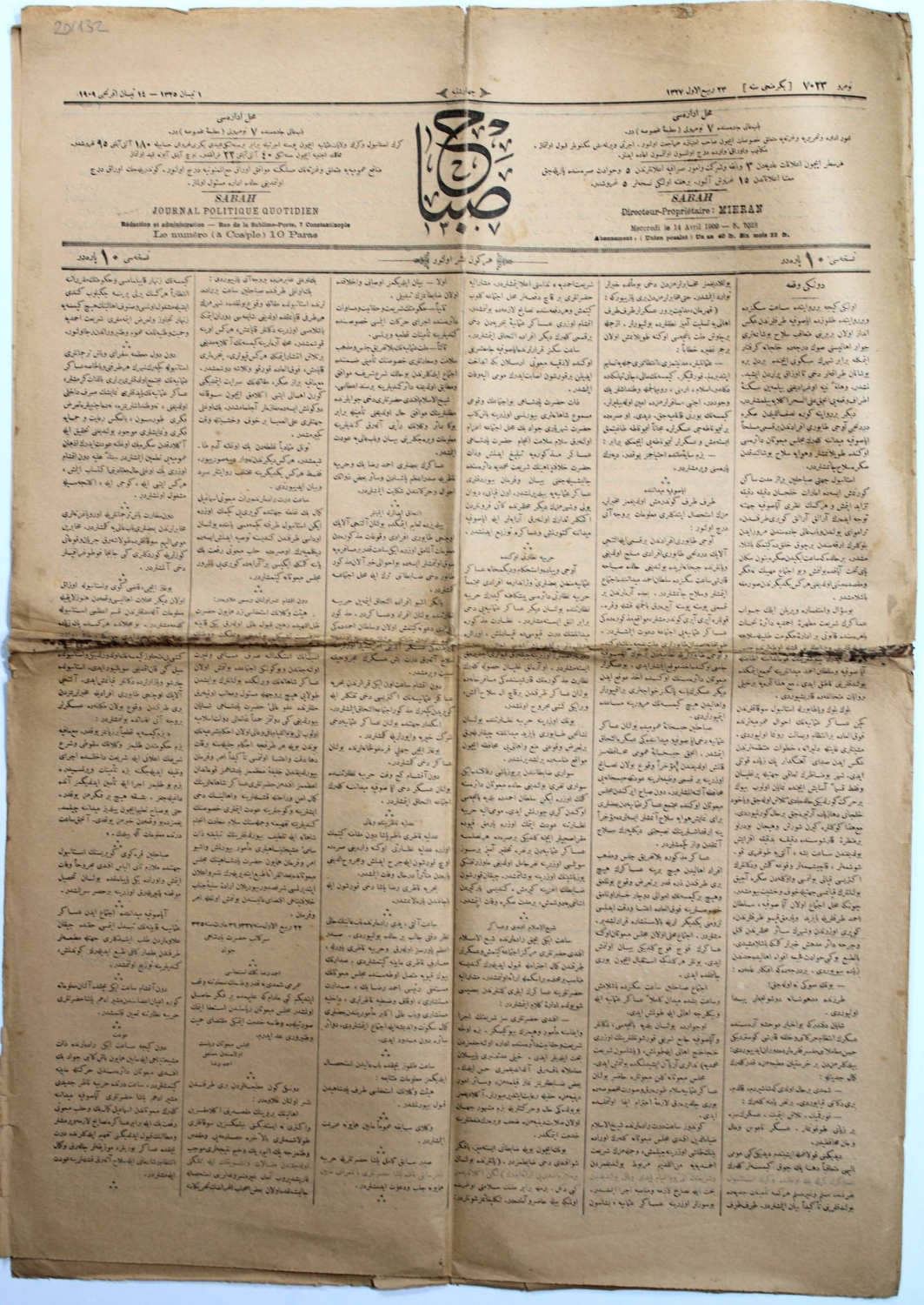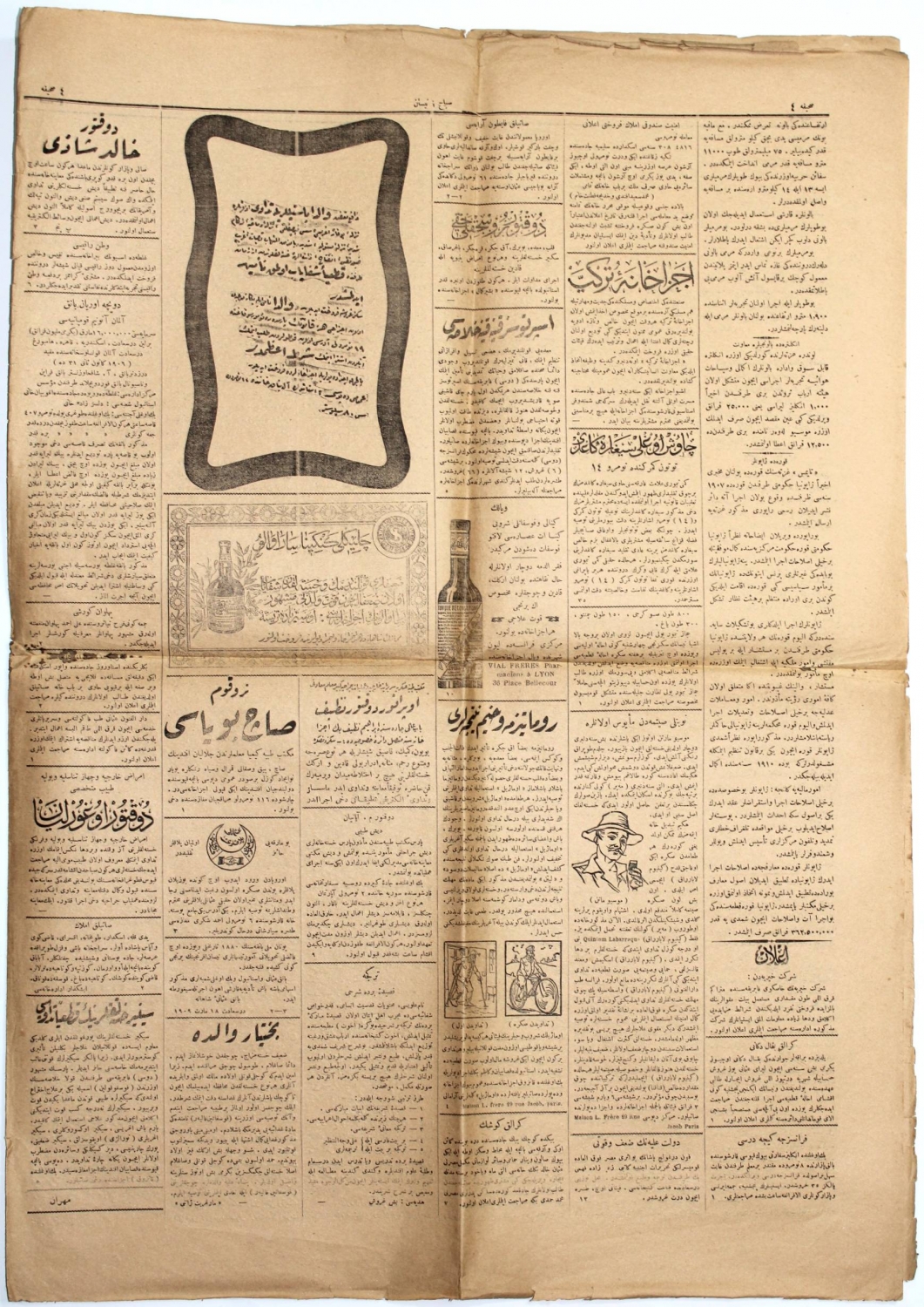 Osmanlı Sabah Gazetesi, 1909 tarihli, Serravallo ve Vial Şarabı Reklamlı, Romatizma hastalığına dair haber, Saç boyası reklamlı, 48x68 cm