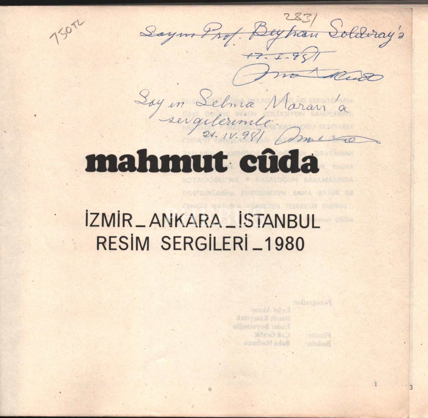 İthaflar, "Sayın Prof. Beyhan [?]´a 12.I.981 Mahmut Cûda" ve "Sayın Selma Moran´a sevgilerimle. 21.IV.981 Mahmut Cûda" şeklindedir. İlk ithafın üzeri karalanmıştır.