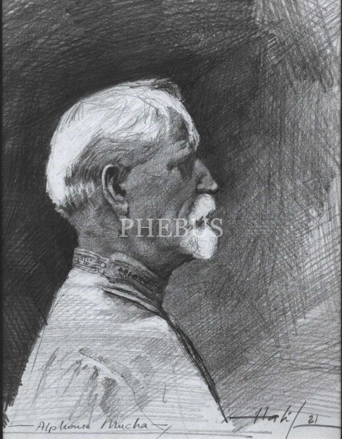 Halil [Gören] imzalı, 2021 tarihli kağıt üzerine karakalem Alphouse Mucha portresi, paspartusuyla birlikte 20x24 cm