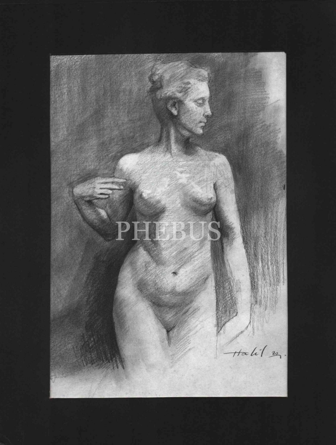 Halil [Gören] imzalı, 2020 tarihli kağıt üzerine karakalem nü çalışma, paspartusuyla birlikte 24x31 cm