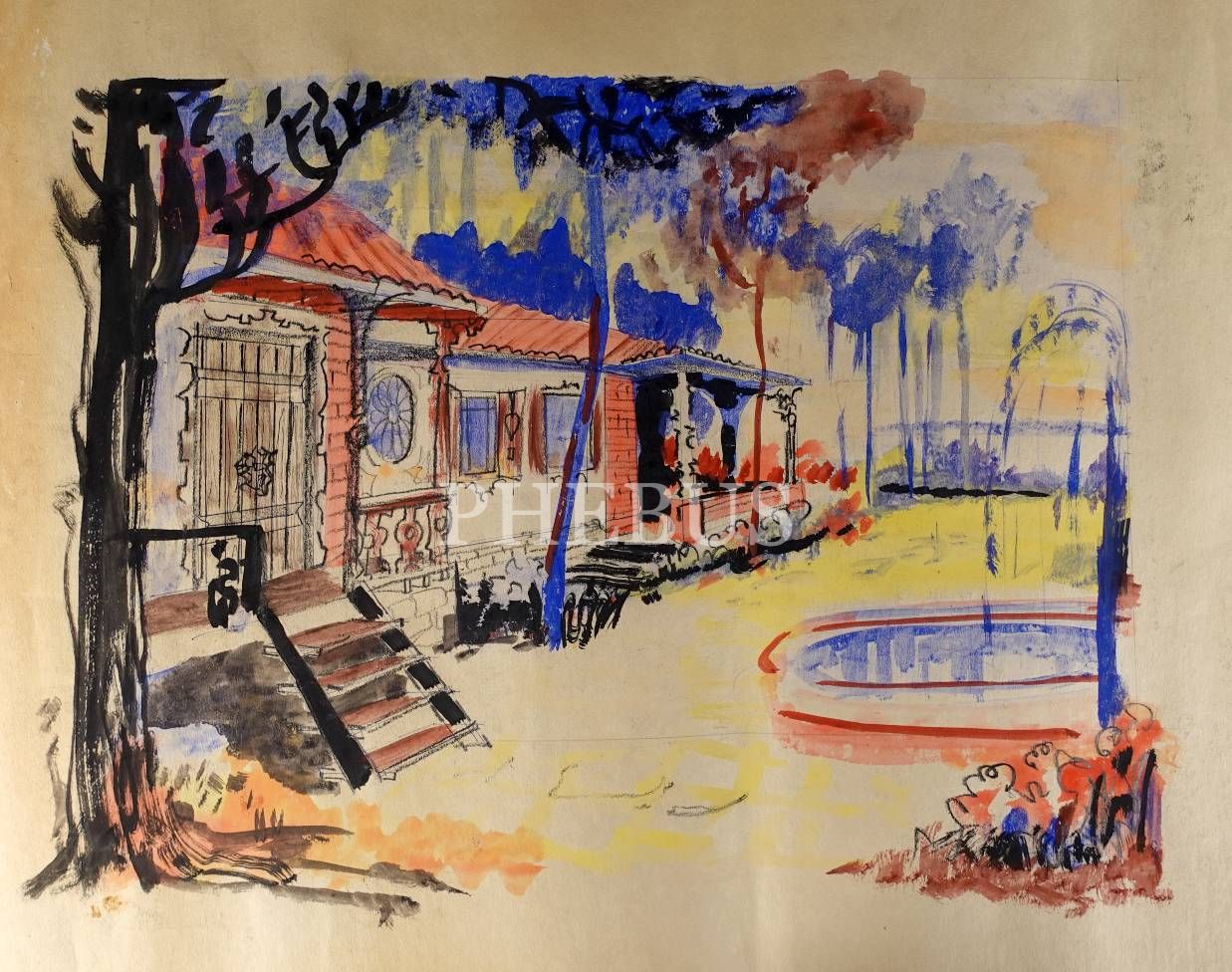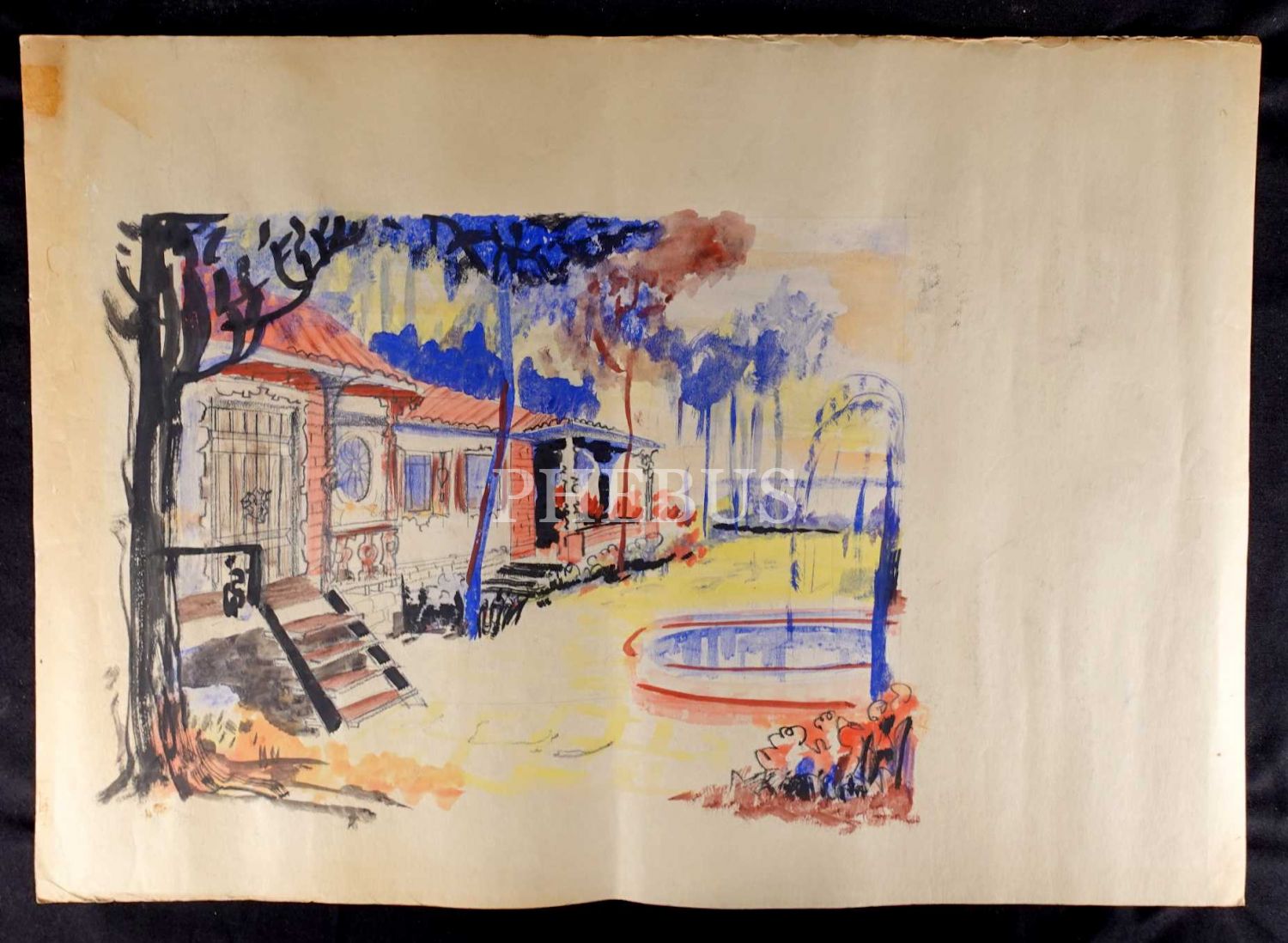 Şadan Bezeyiş terekesinden kağıt üzerine suluboya bahçe çizimi, 70x50 cm