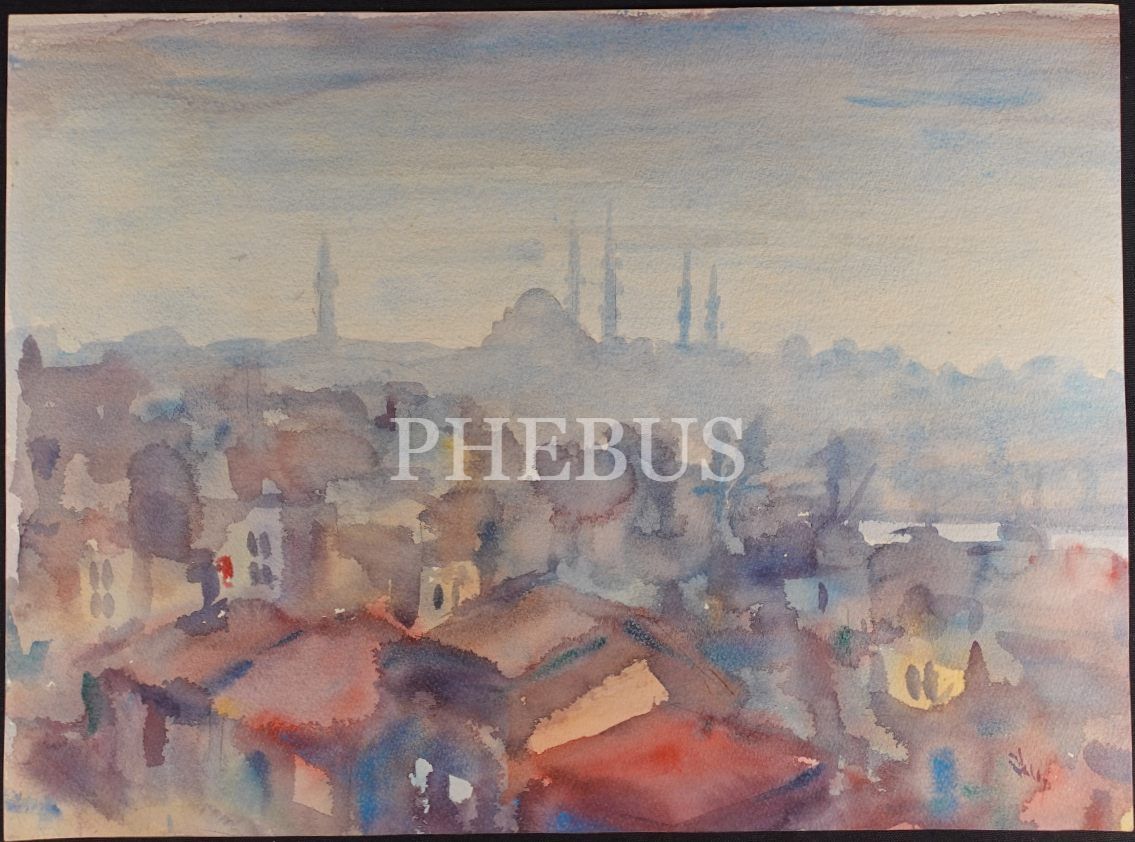 Ahmet Fazıl Aksoy´dan imzalı karton üzerine suluboya İstanbul çizimi, 51x38 cm