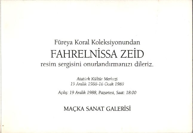 "Füreya Koral Koleksiyonundan Fahrelnissa Zeid resim sergisi" davetiyesi, Atatürk Kültür Merkezi - 19 Aralık 1988-16 Ocak 1989, 17x12 cm