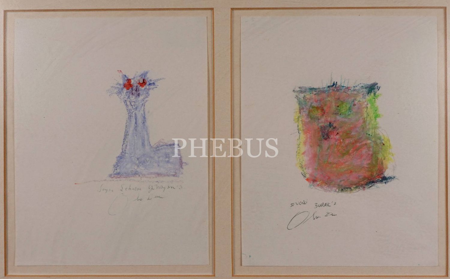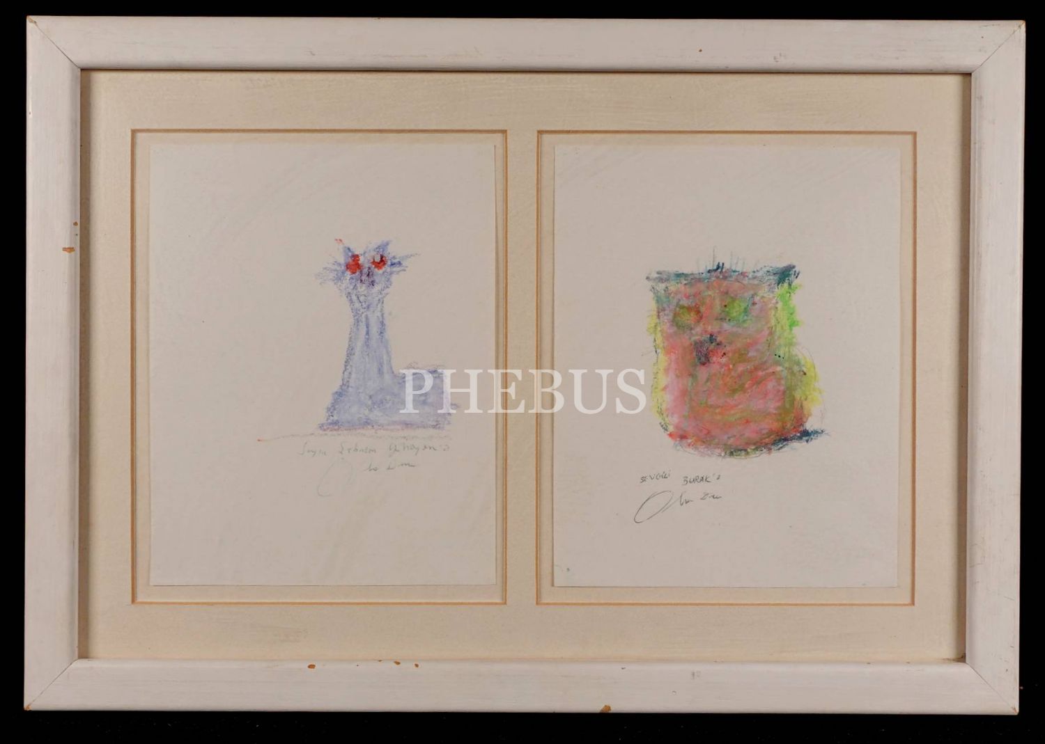 Orhan Duru´dan ithaflı ve imzalı, aynı çerçeve içinde kağıt üzerine pastel iki adet kedi figürü, 40x28 cm