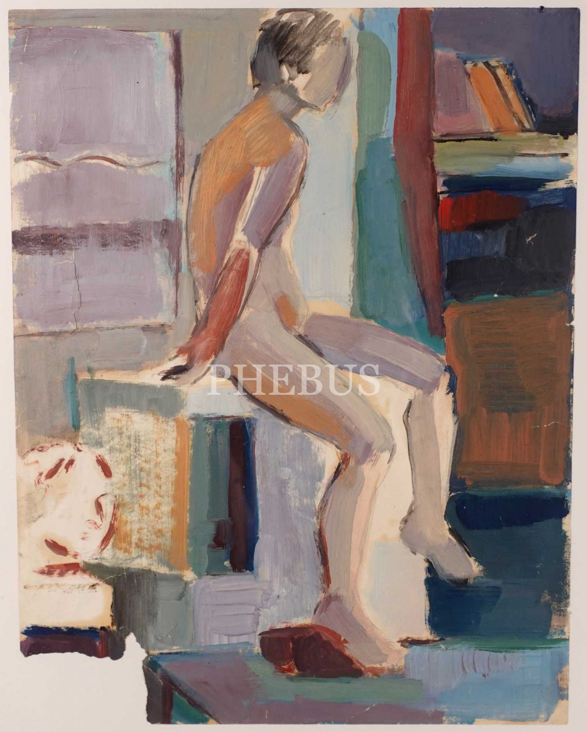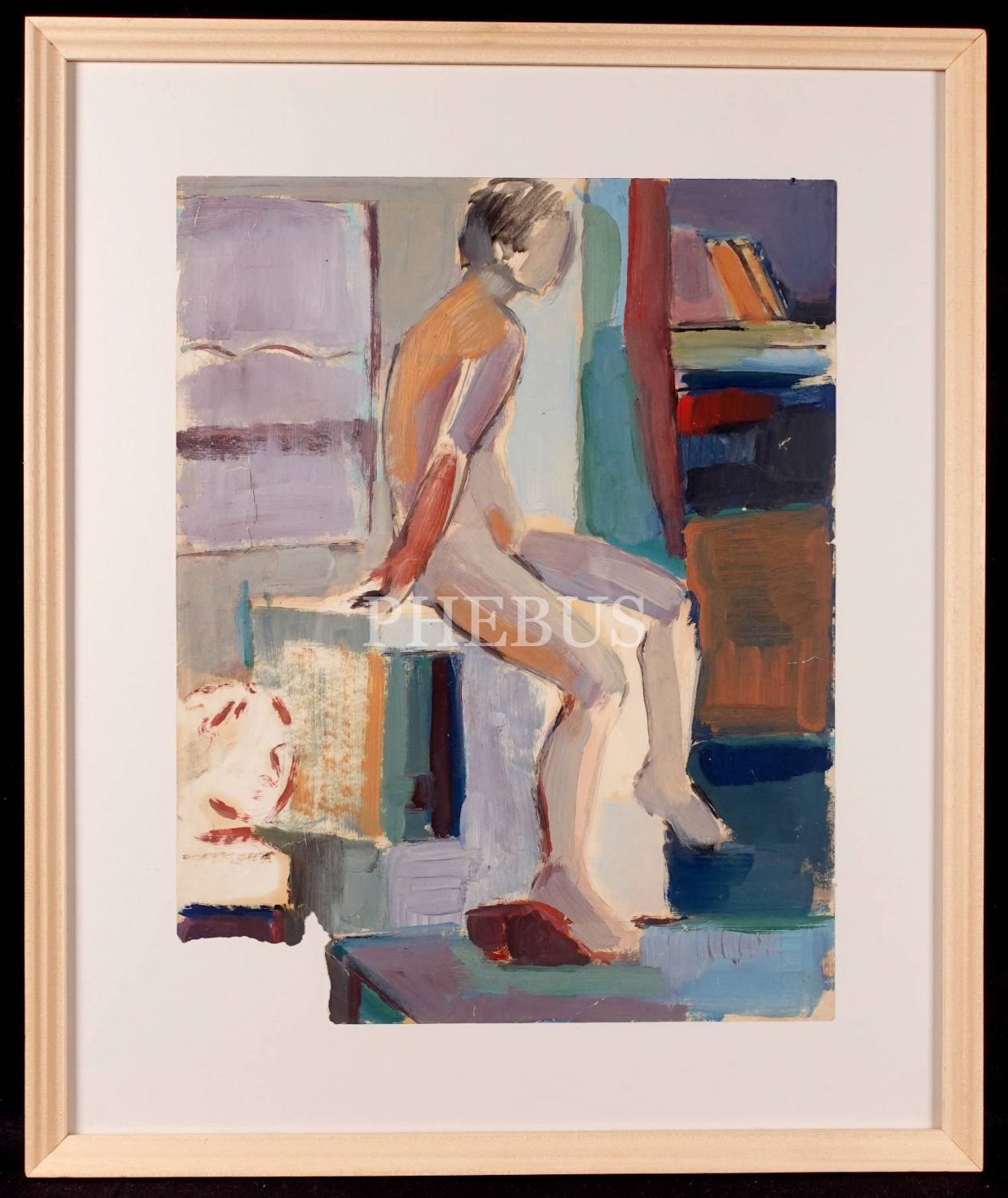 Cemal Tollu´dan kağıt üzerine yağlıboya Atölyede Oturan Çıplak çalışması, çerçevesiyle birlikte 33x40 cm, imzasız