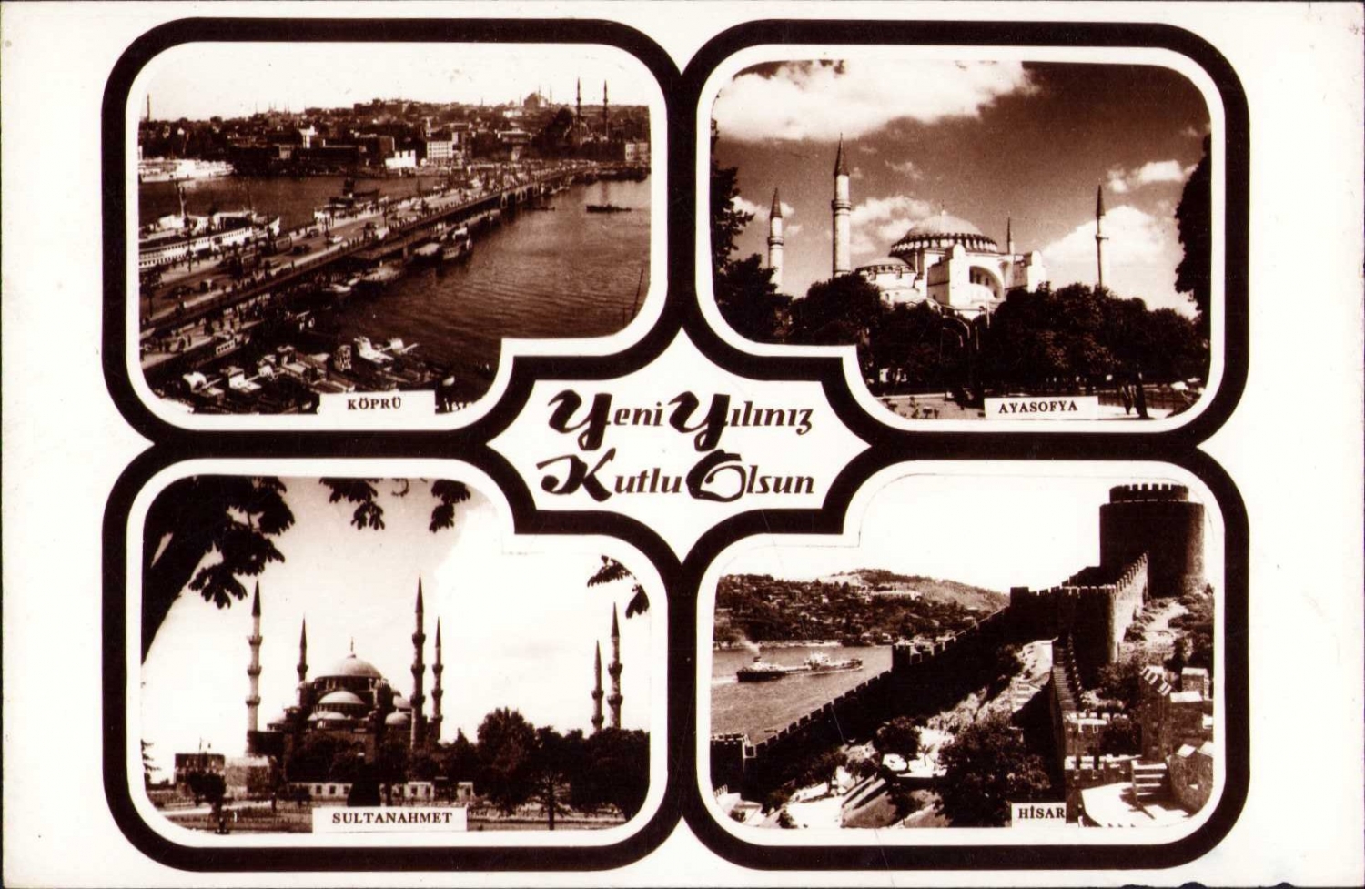 Yeni yıl kartı 4 farklı İstanbul görünümlü; Köprü, Ayasofya, Sultanahmet, Hisar