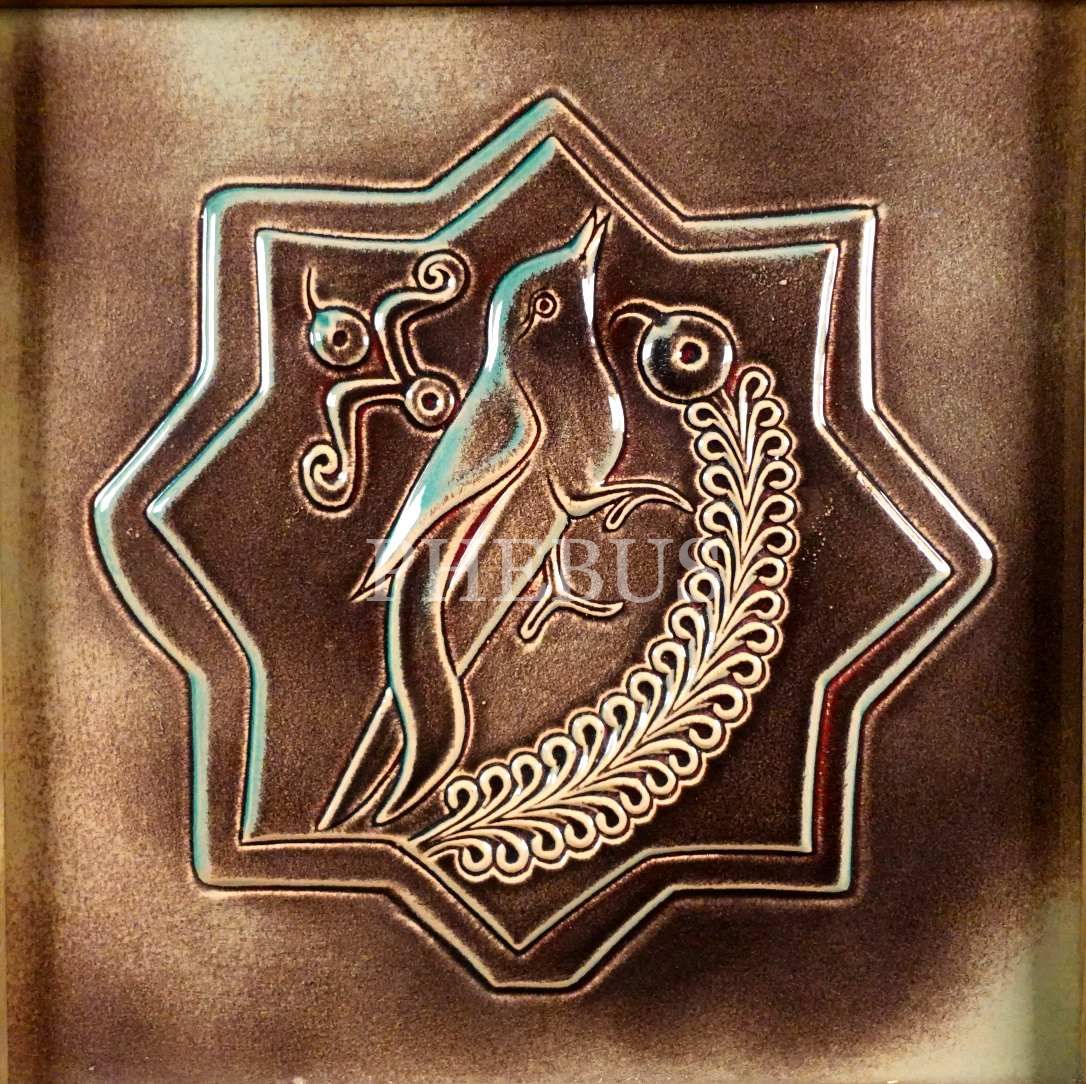 "Çanakkale Seramik fabrikaları sanat atölyesinde seramik sanatçısı Mustafa Tunçalp tarafından Prof. Dr. Rüçhan Arık başkanlığında Anadolu Selçuk dönemi 13. yüzyıl sonu Kubad Abad sarayı 2002 kazılarından çıkarılan çinilerden esinlenerek çalışılmıştır. 2003-ÇAN"