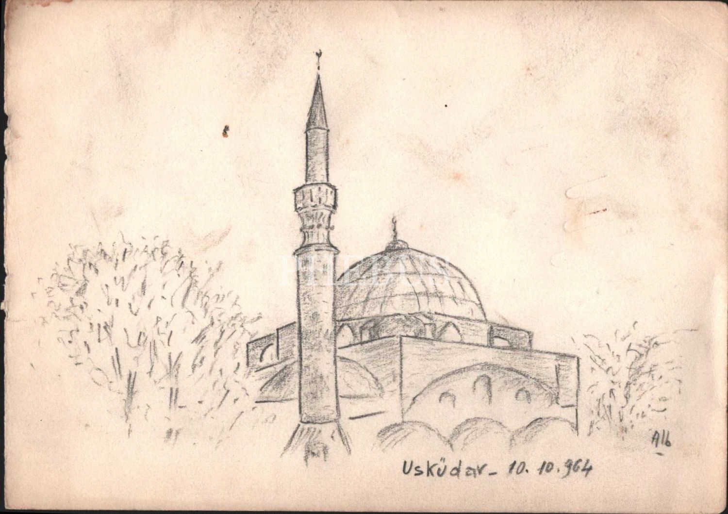 O. Alb. kısaltma imzalı, 1964 tarihli kağıt üzerine karakalem Üsküdar çizimi, 24x17 cm