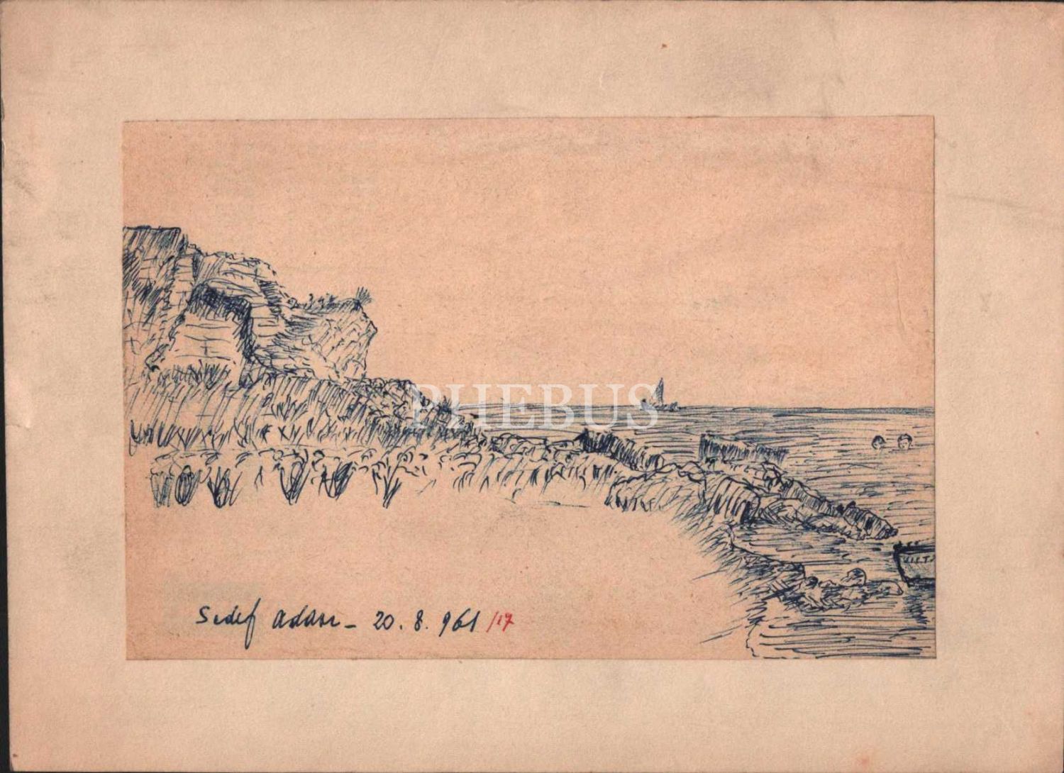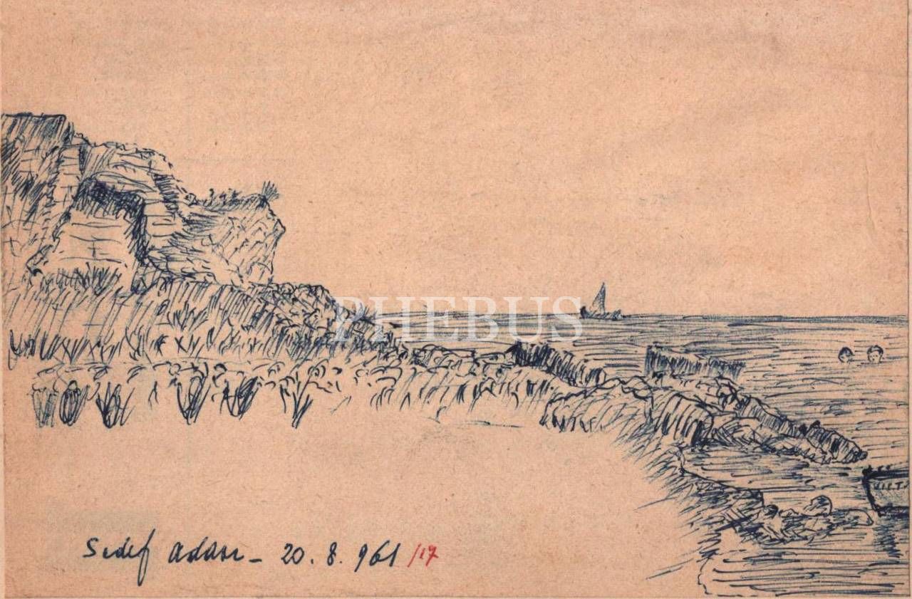 O. Alb. kısaltma imzasını kullanan ressamın terekesinden, 1961 tarihli kağıt üzerine mürekkep Sedef Adası çizimi, 21x15 cm