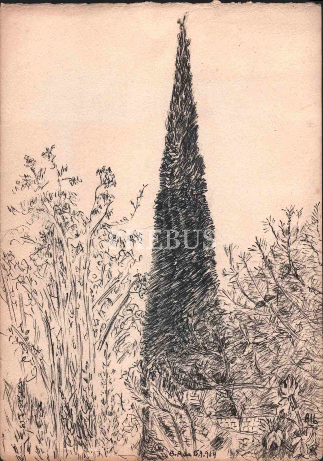 O. Alb. kısaltma imzalı, 1964 tarihli kağıt üzerine karakalem Büyükada çizimi, 17x24 cm