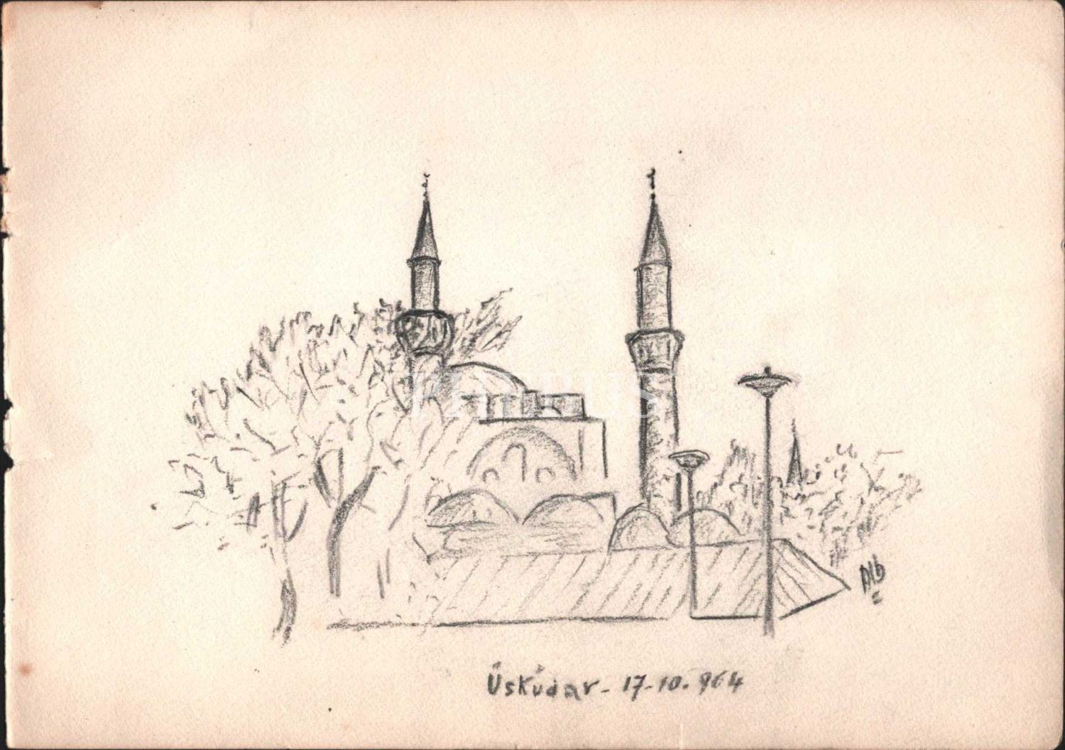 O. Alb. kısaltma imzalı, 1964 tarihli kağıt üzerine karakalem Üsküdar çizimi, 24x17 cm