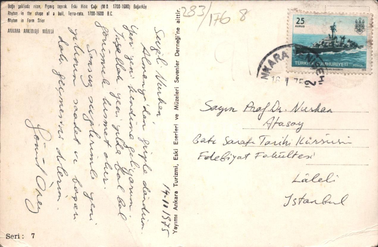 Sanat tarihçisi Prof. Dr. Gönül Öney´den Prof. Dr. Nurhan Atasoy´a gönderilmiş kart arkası mektup, 1975