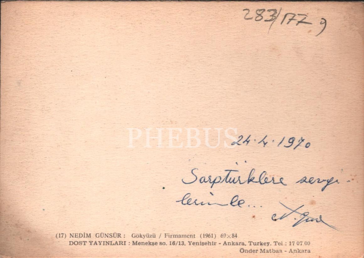 Nedim Günsür´ün "Gökyüzü" resminin görsel olarak kullanıldığı imzalı tebrik kartı, 1970