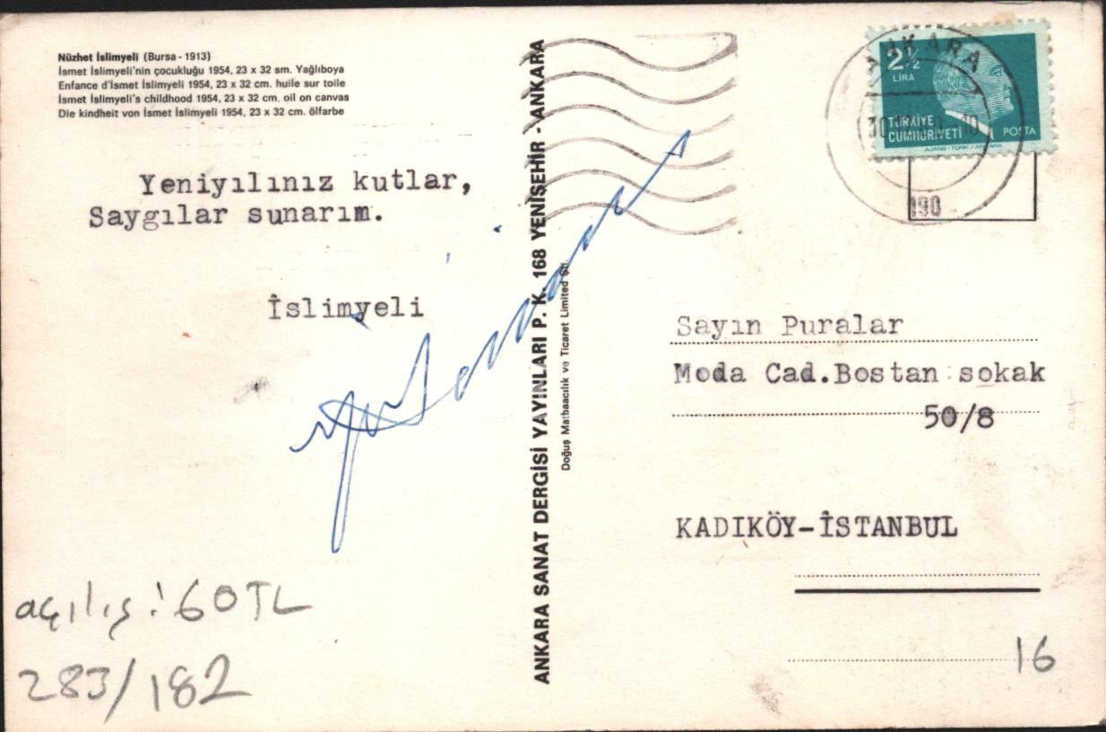 Nüzhet İslimyeli´nin kendi resminden [oğlunun portresi] oluşturulmuş, imzalı tebrik kartı