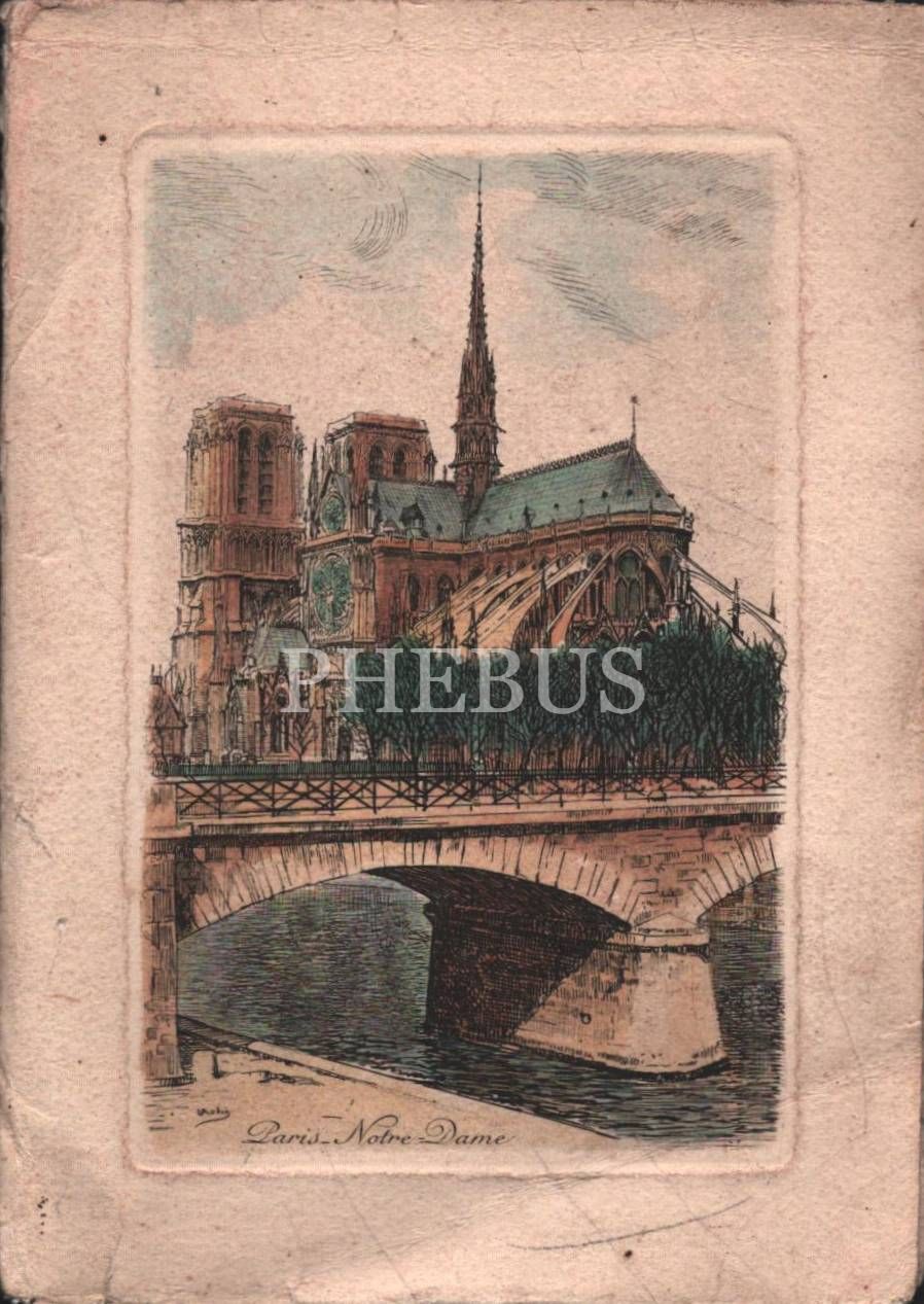 Paris - Notre Dame konulu, renkli gravür baskı bayram tebrik kartı, 1954