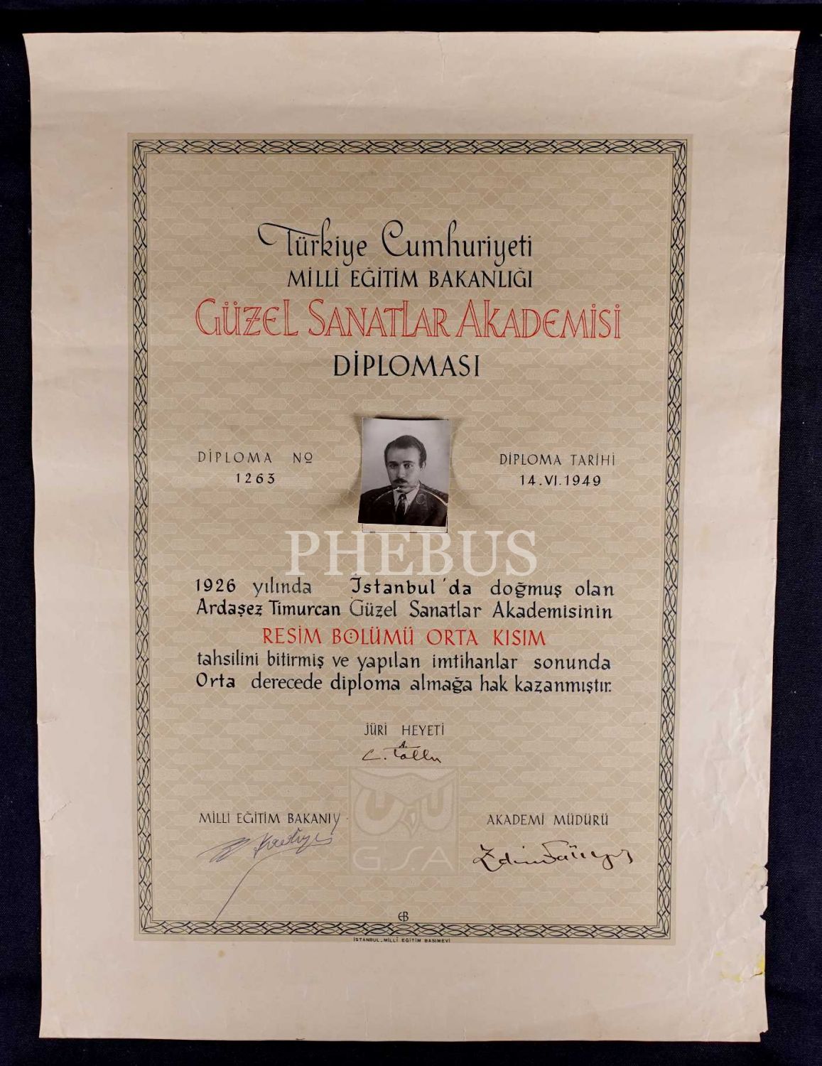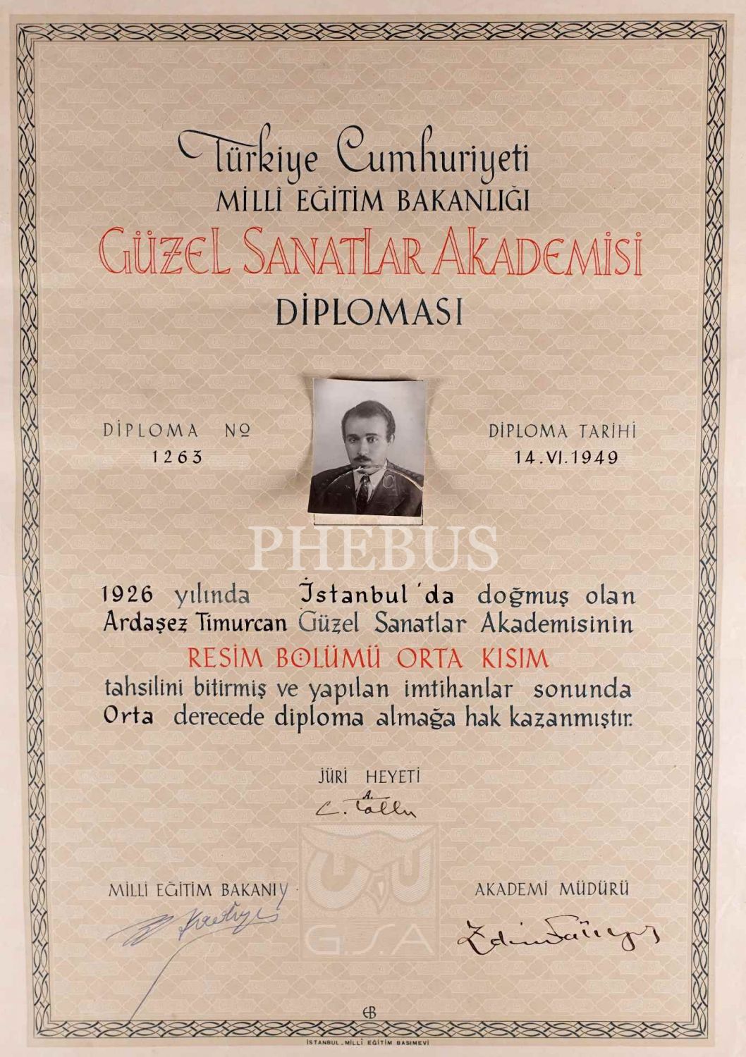 Ardaşez Timurcan´ın 1949 tarihli Güzel Sanatlar Akademisi diploması, Cemal Tollu, Zeki Faik İzer ve H. Tahsin Banguoğlu imzalı, Tasarım: Emin Barın, 40x53 cm