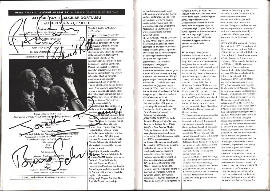 Allegri Yaylı Çalgılar Dörtlüsü´nden imzalı 25. ULUSLARARASI İSTANBUL MÜZİK FESTİVALİ kitapçığı, 1997, 250 sayfa, 19x27 cm