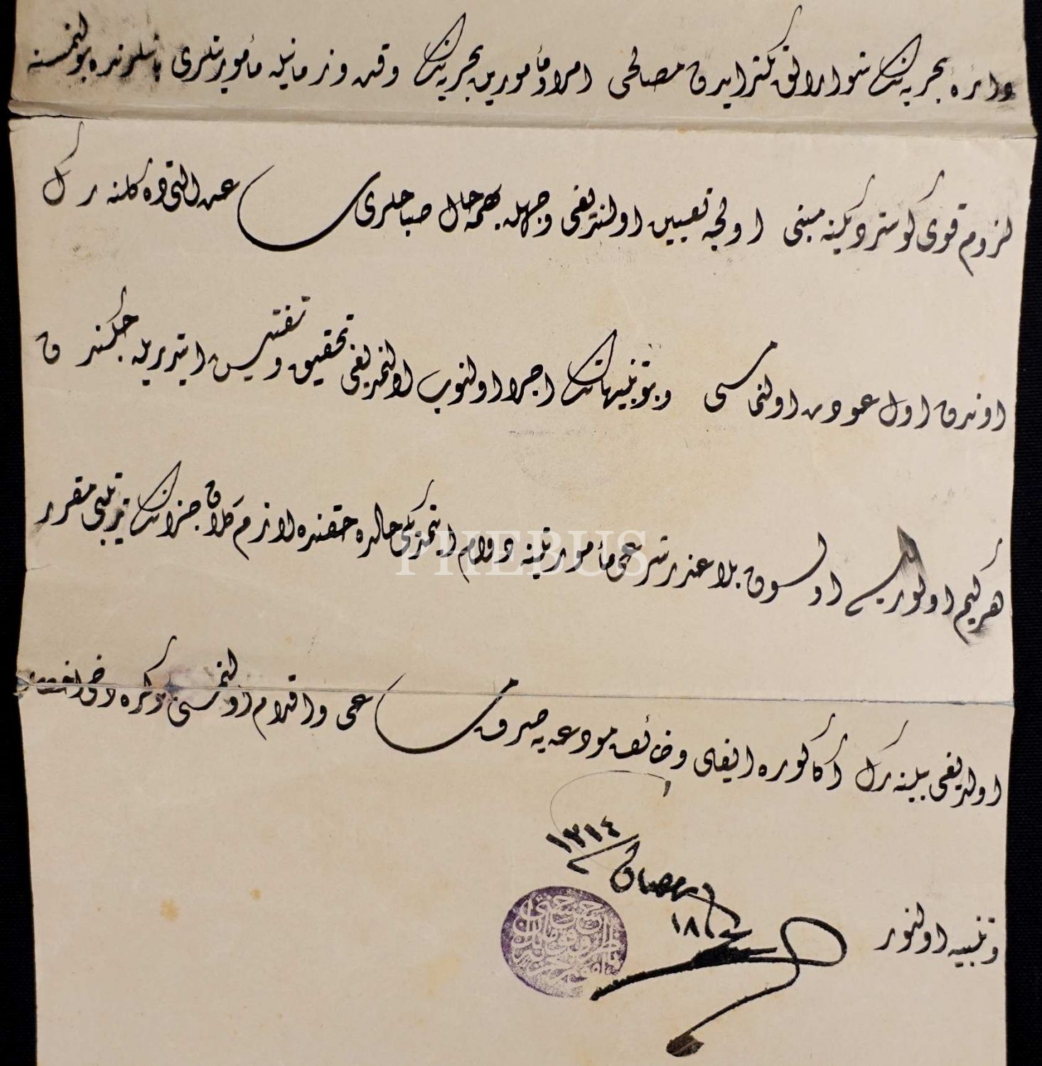 Denizcilik tarihi: Bahriye Dairesi´ndeki mesai saatleri düzenlemesi hakkında 1314 tarihli uyarı mektubu, Umur-ı Bahriye Nazır ve Kumandan mühürlü, 22x50 cm