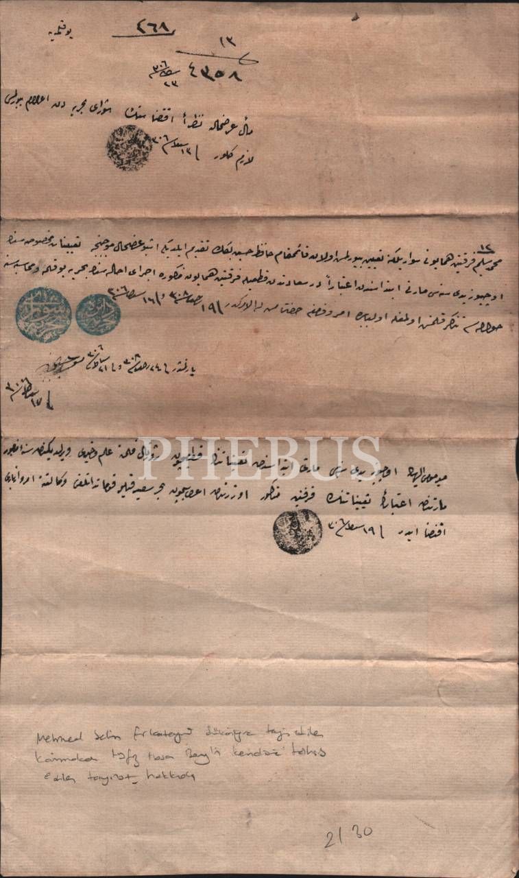 Denizcilik tarihi: Mehmed Selim Fırkateyni süvariliğine atanan Kaimmakam Hafız Hasan Bey´in tayınat değişikliğine dair talebi, Bahriye Dairesi mühürlü ve 1306 tarihli, 20x34 cm