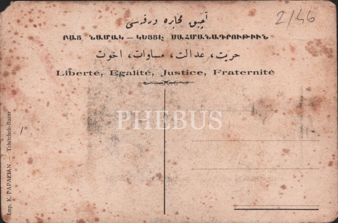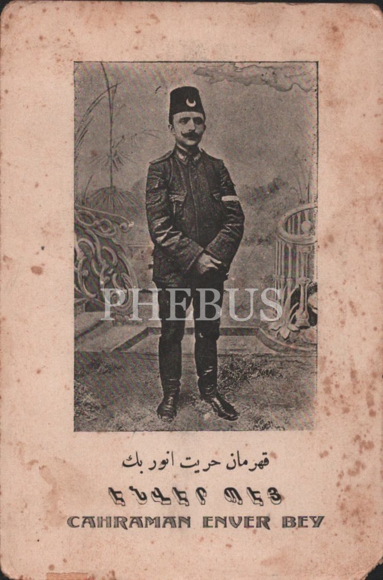 Meşrutiyet kartpostalı: Osmanlı, Ermeni ve Latin harfleriyle "Hürriyet Kahramanı Enver Bey", yay. K. Papazian