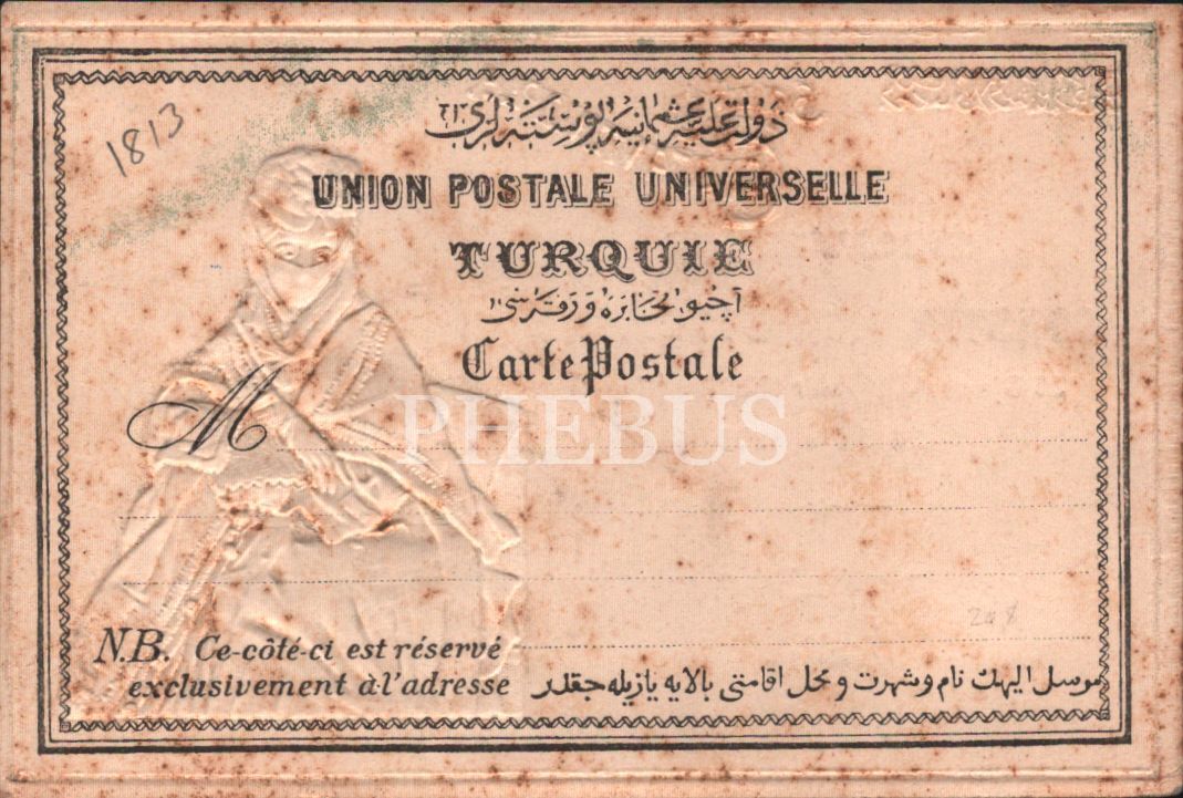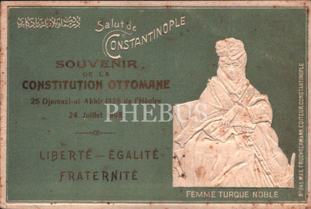 "Dersaadet Bilad-ı Selase Yadigârı": Osmanlı kadını görselli gofre Meşrutiyet kartpostalı, ed. Max Fruchtermann, Constantinople