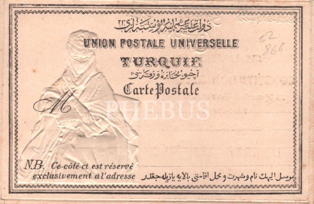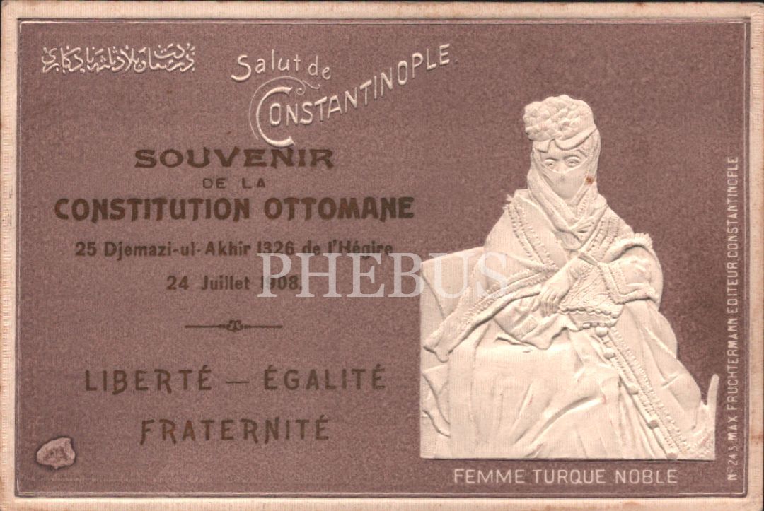"Dersaadet Bilad-ı Selase Yadigârı": Osmanlı kadını görselli gofre Meşrutiyet kartpostalı, ed. Max Fruchtermann, Constantinople