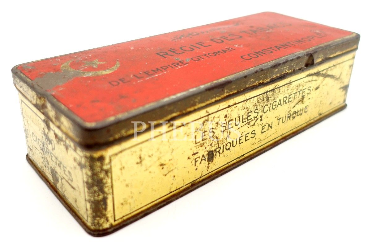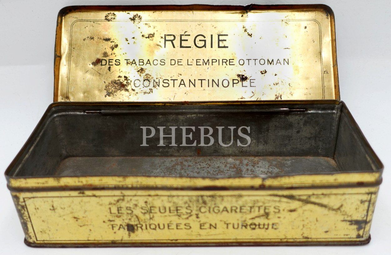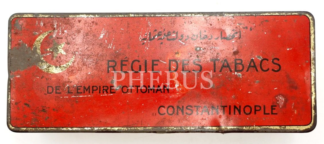 Osmanlıca-Fransızca "İnhisar-ı Duhan-ı Devlet-i Aliyye-i Osmaniye" yazılı ve ay yıldızlı boş teneke kutu, Constantinople, 5x7x19 cm
