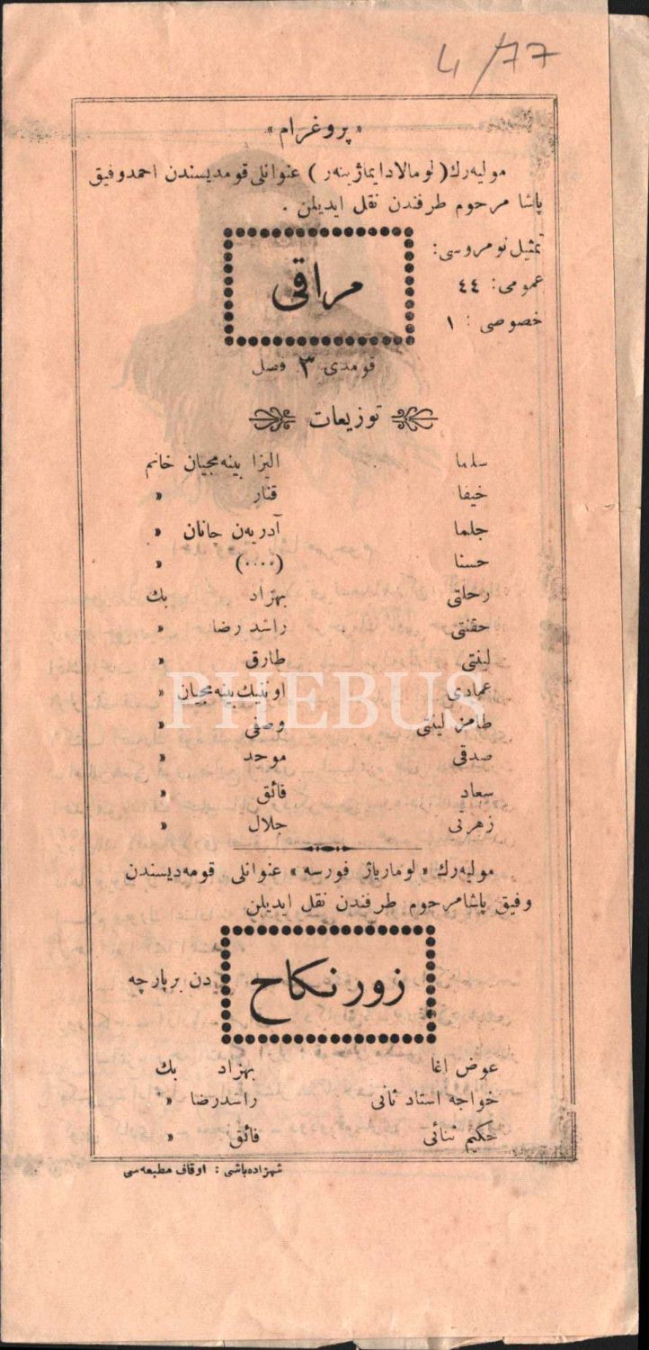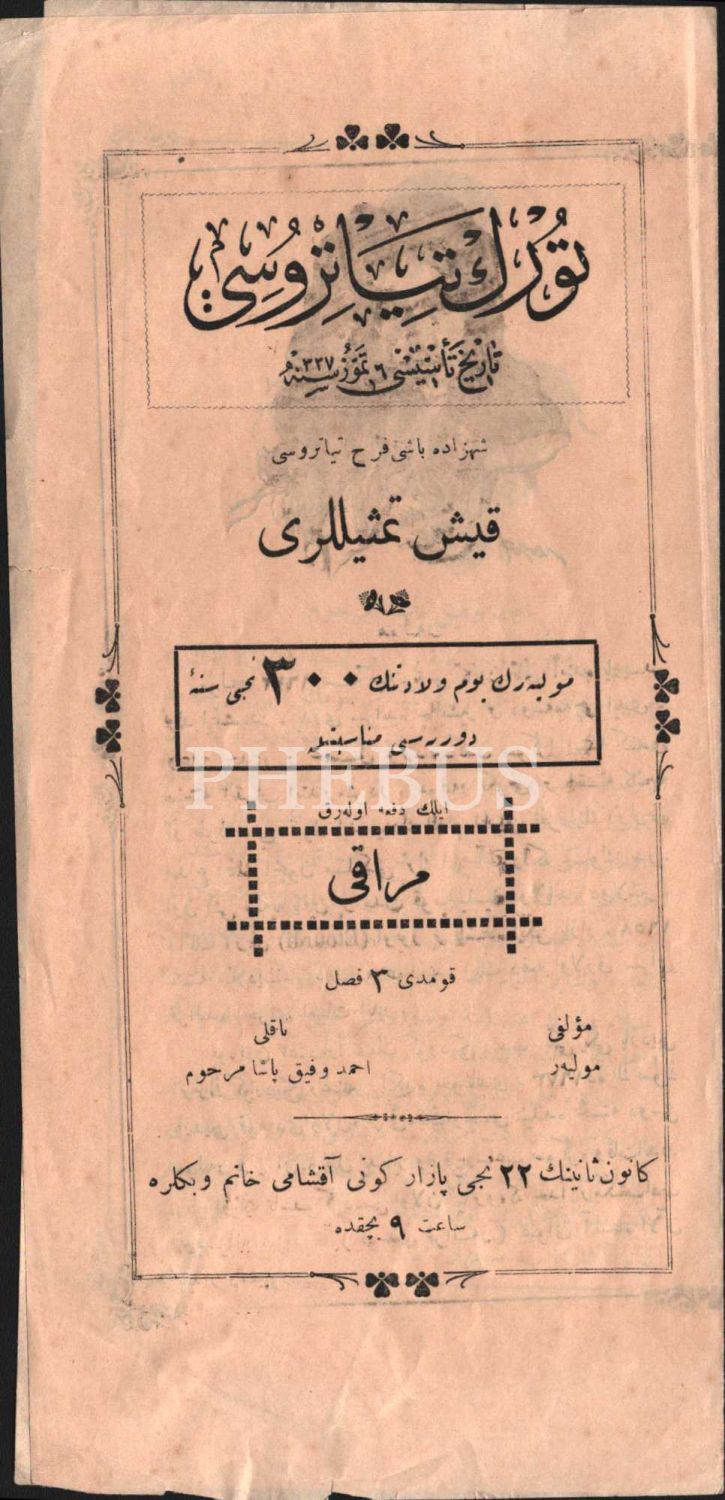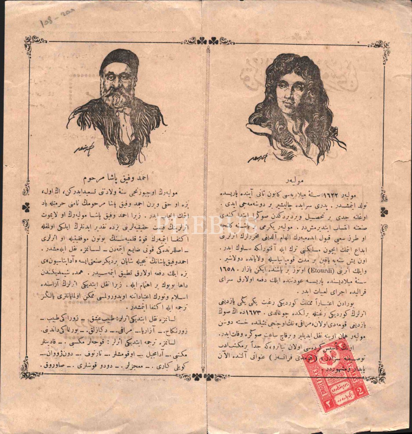 Tiyatro tarihi: Türk Tiyatrosu´nda sergilenecek ve Moliere´in yazıp Ahmed Vefik Paşa´nın tercüme ettiği MERAKİ oyununun el ilanı, 24x25 cm, ortadan kısmen ayrık haliyle