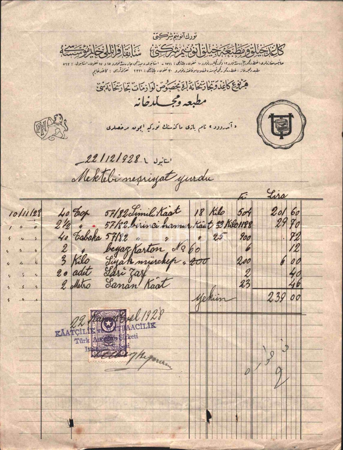 Kâğıdcılık ve Matbaacılık Anonim Şirketi´nden Mekteb-i Neşriyat Yurdu adına kesilen fatura, İstanbul 1928, 21x28 cm, kenarı yırtık haliyle