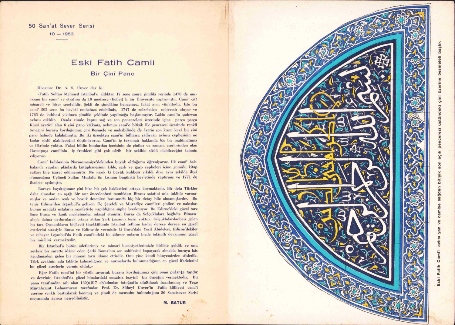 Eski Fatih Camii Bir Çini Pano, Süheyl Ünver'in takririyle çiniyi hazırlayan:Muzaffer Batur, Kemal Matbaası, İstanbul, 1953,